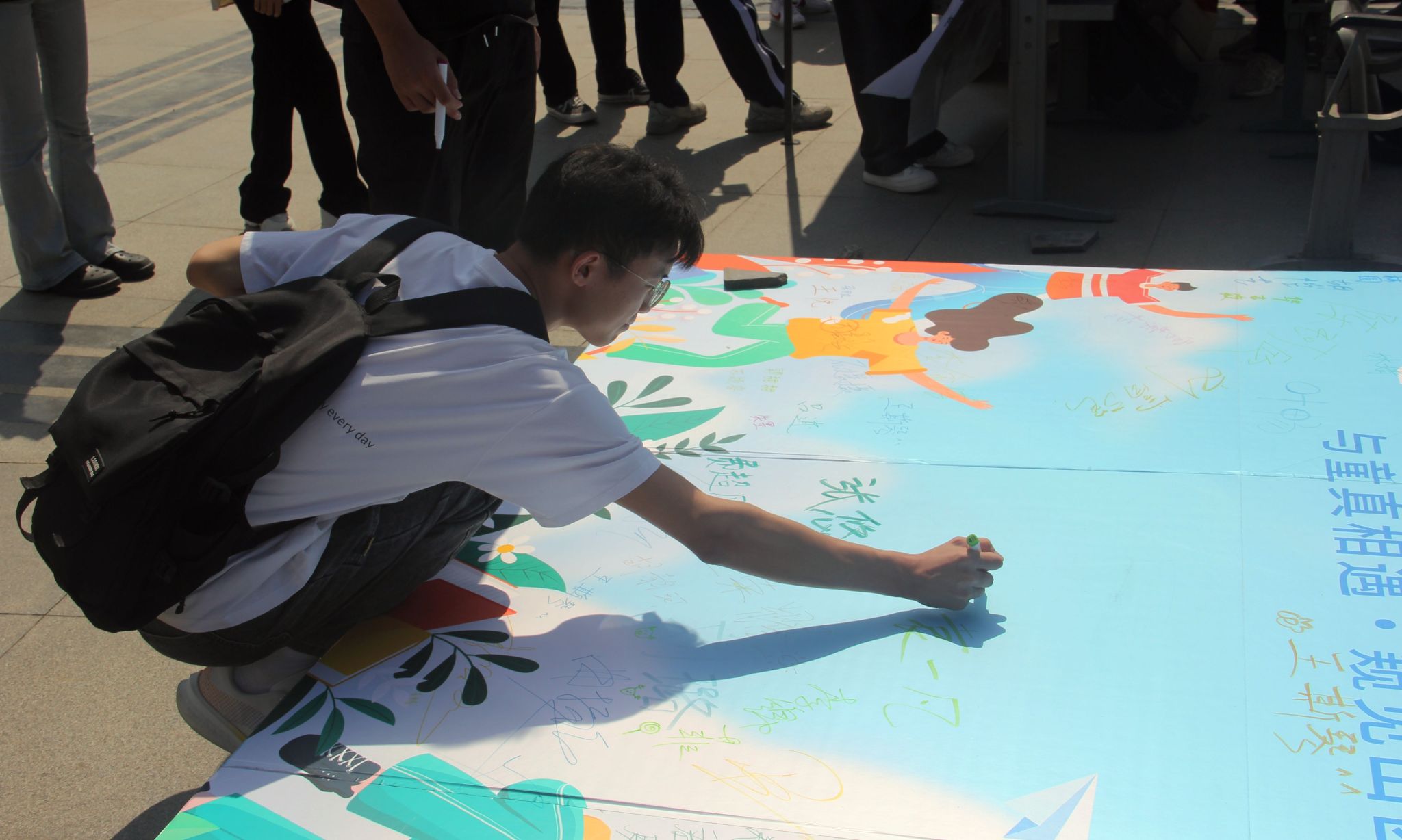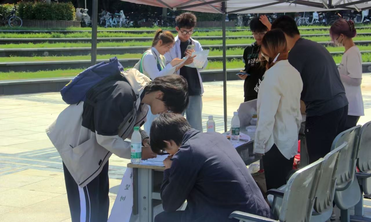 金明校区马可广场开设了线下活动摊位。志愿者向参加活动的学生们详细介绍了活动内容、流程、规则与意义,并让他们在香蕉视频