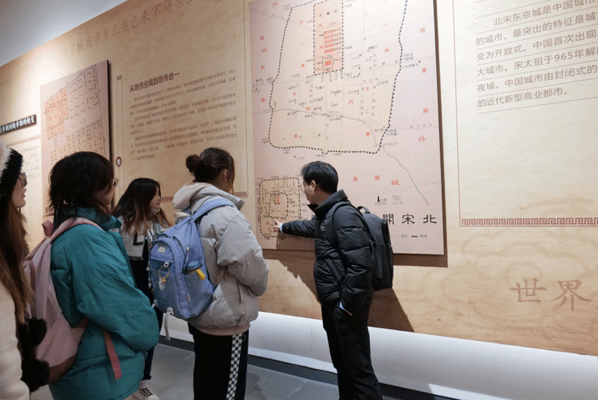 接着,“北宋东京城”的主题展览将师生带回到北宋时代,使学生深入感受东京城在城市结构、城市交通、城市管理、造园艺术多方面的领先性,在商业贸易、文化交流方面的国际性,在市民艺术方面的丰富性。在此过程中,杨阳以清明上河图为例,向学生们介绍北宋时期东京城的市井文化、商业文化,细腻地解读了东京城的繁华景象。姚飞谈到,开封的中轴线历经千年的沧桑、时代的变迁,但其中轴线却始终从未发生变化,是世界上独有的景象,激发了学生们的广泛讨论。