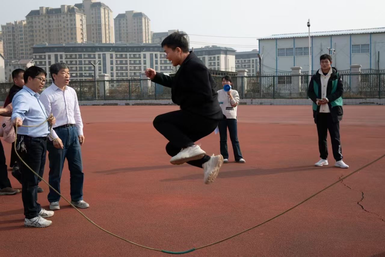 在“赶猪入栏”比赛项目中,教师们手持木质长杆,躬身如满弦之弓,附身待发。随着发令声响,足球在杆头灵活的拨动下蛇形穿梭,巧妙绕过重重障碍。当首棒教师顺利归栏后,接力教师迅速接过木杆返程,发丝飞扬间尽显矫健身姿。赛道旁“注意节奏!”“稳住方向!”的呐喊此起彼伏。当末棒教师携球冲过终点线,他们汗湿的额角与灿烂笑颜交相辉映,充分展现出团队协作的魅力。足式保龄球项目的赛场同样精彩。教师们目光如炬,或屈膝蓄力、或侧身摆腿,跃跃欲试。场边观众随着足球轨迹屏息凝神,每当“嘭”的一声脆响,水瓶应声而倒,全场喝彩声似汹涌浪潮,澎湃而起,将现场气氛烘托得热烈非凡。在随后的沙包背抛项目中,教师们提前进行了适应性训练。只见他们手臂一挥,沙包自背后抛出,在空中划出一道道优美的抛物线,稳稳落在目标区域内,赢得了全场观众的掌声。压轴的跳长绳项目将活动气氛推向顶点。长绳在摇绳者们默契的圆弧轨迹中翻飞起舞,参赛教师们全神贯注,看准节奏轻盈跃入。受现场热烈气氛感染,学生们纷纷响应教师邀请加入跳绳行列。跃动的身影既展现了师生们的运动活力,又在协作配合中加深了彼此默契,拉近了心灵上的距离。经过激烈的角逐,最终“行政”工会小组摘得桂冠。