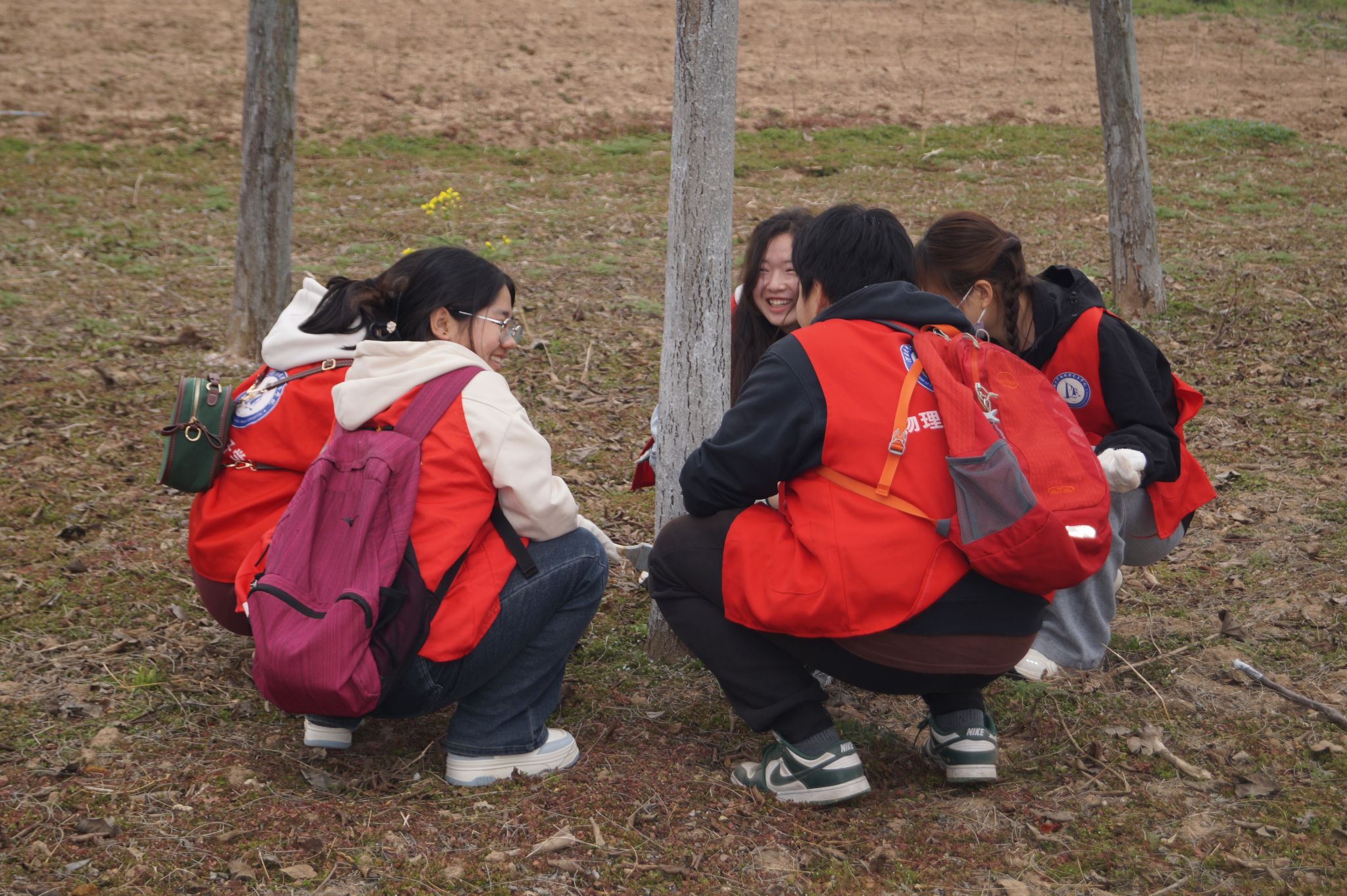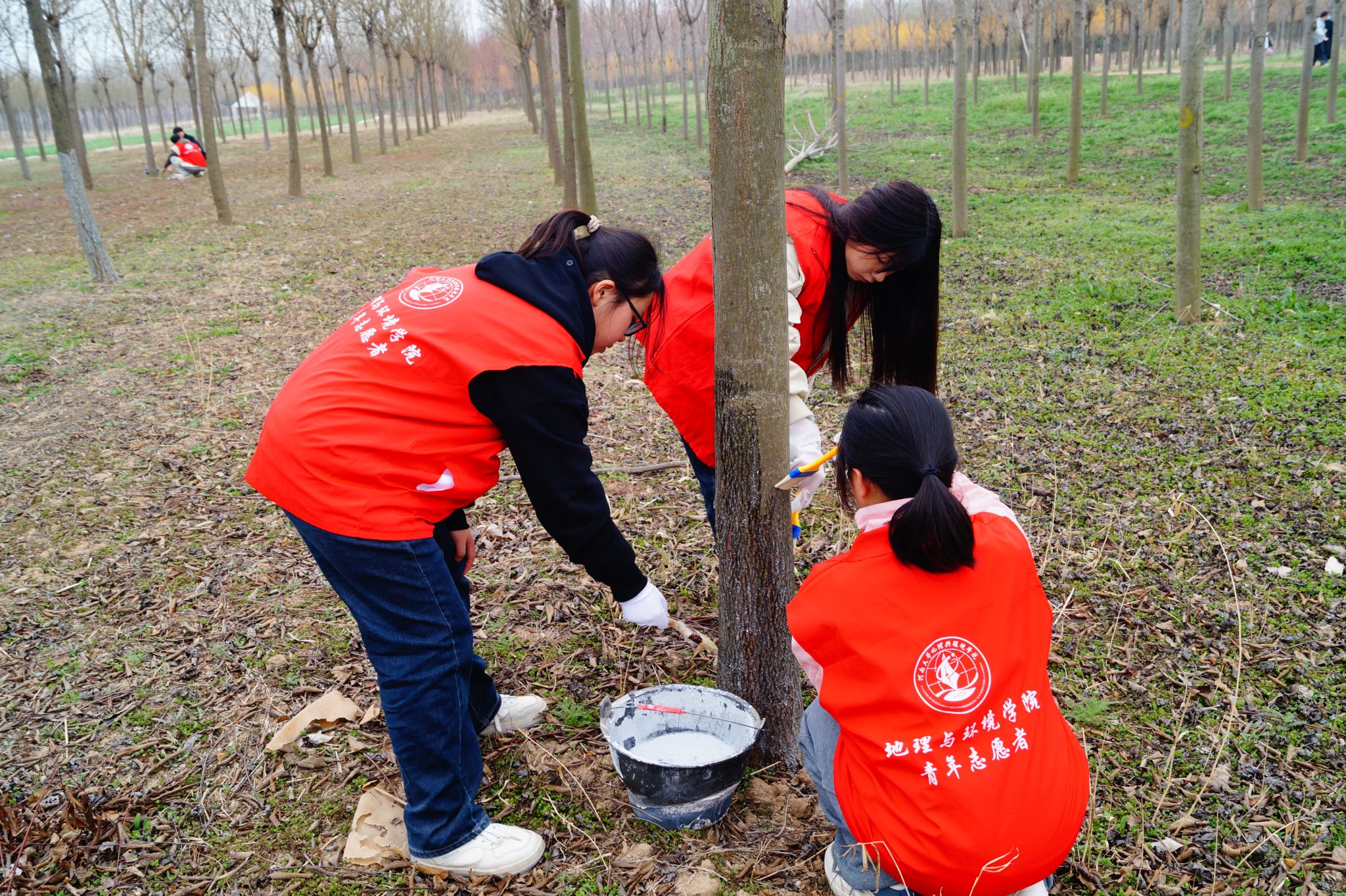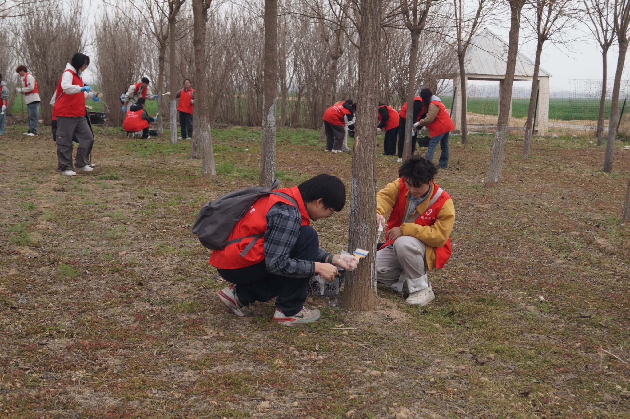 刷白工作完成后,志愿者们热情不减,积极投入到新的护苗工作中。部分志愿者拿起铲子为树木周边除草翻土,部分志愿者为涂白后的树木刷上一圈红漆。大家动作熟练,配合愈发默契。午后阳光照耀下,树苗枝干上的药液和志愿者额头上的汗水都闪烁着光芒,苗圃中初芽点点,呈现出一片生机盎然的景象。