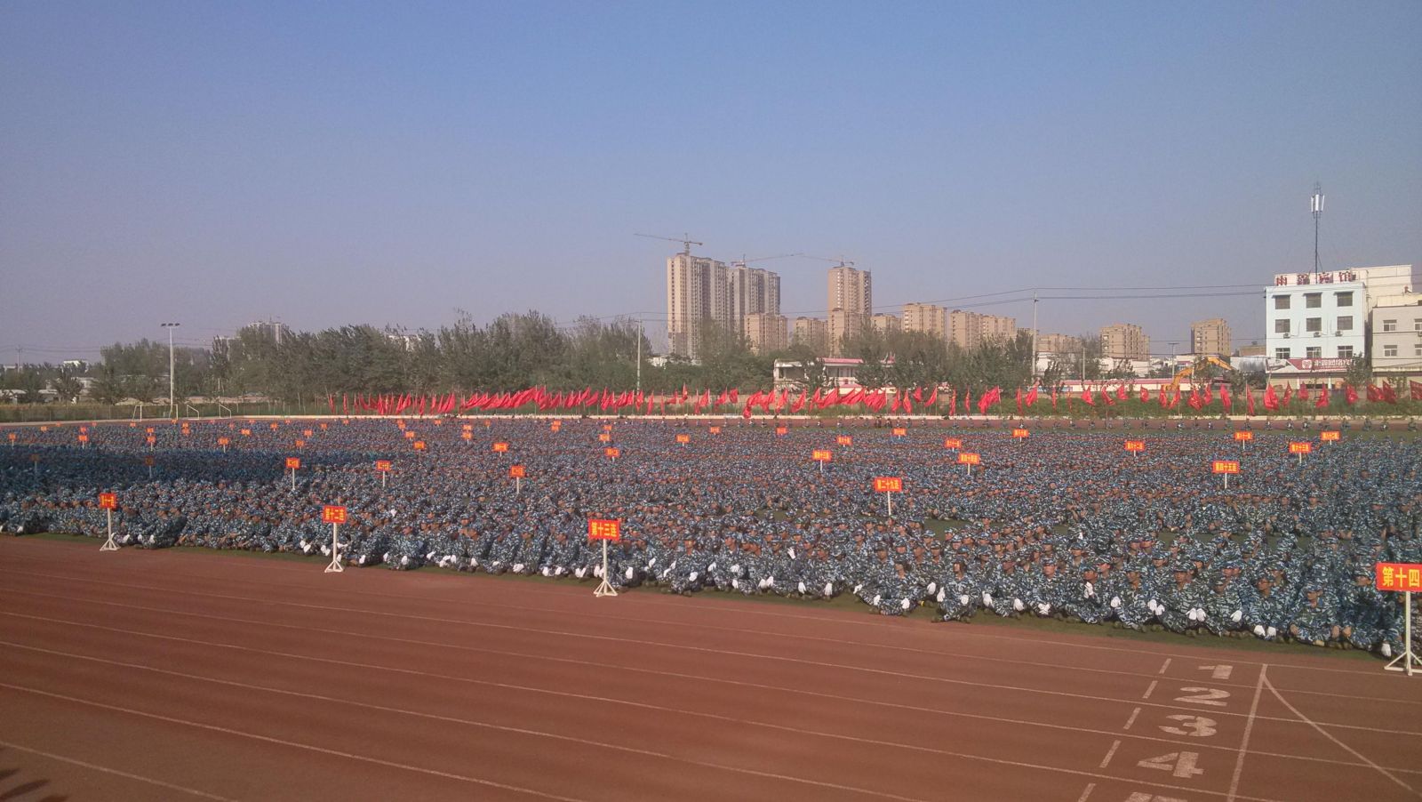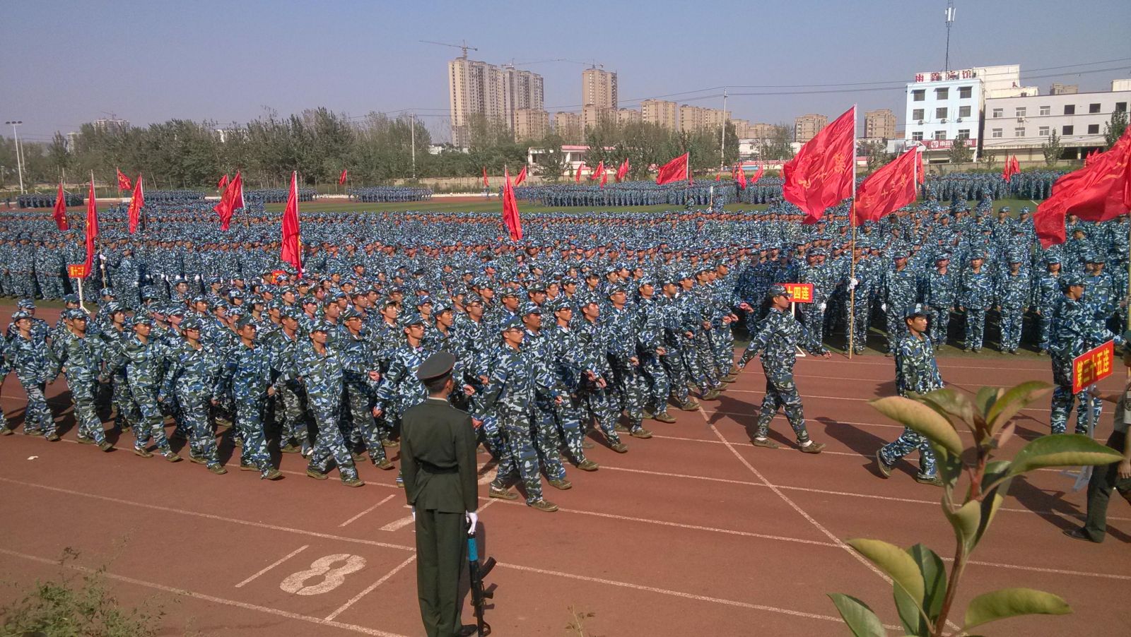 2013级新生军训团表示了深切的慰问,并向全体教官表示了由衷的感谢。我环境与规划学院2013级学子蓄势待发,誓用笔直挺拔的军姿,坚定不移的步伐与雄健豪迈的呐喊来表达对校领导、教官们的崇高敬意以及今朝定创佳绩的信心。在九十二个连队检阅完毕后,新生代表作了发言。大会上,副校长刘志军向承训部队赠送了锦旗。副校长关学增宣读了军训内务检查标兵连队、歌咏比赛获奖连队、分列式和综合评比优胜连队名单。会场上掌声欢呼声此起彼伏,整个会场成了一片迷彩的海洋。