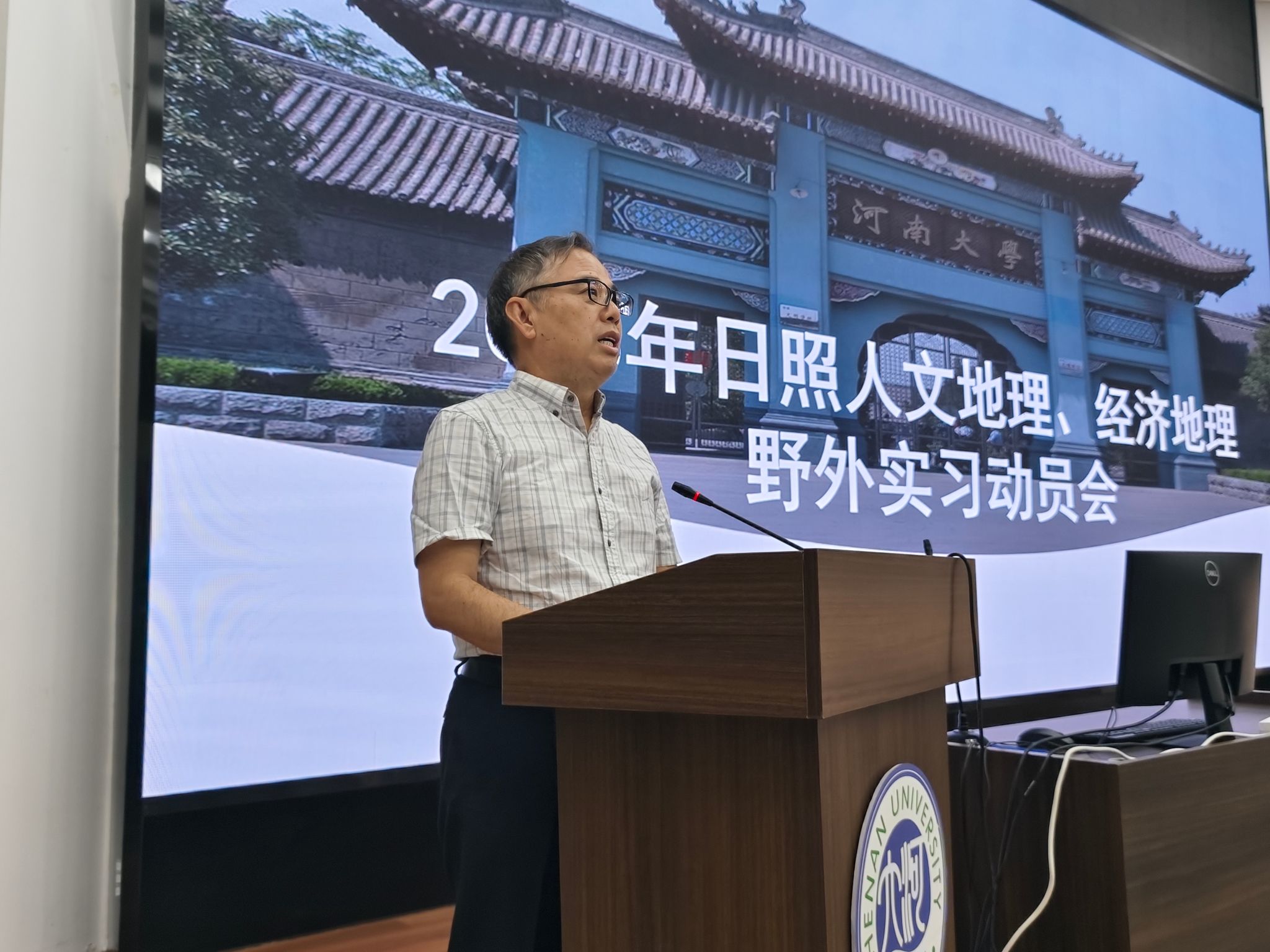 会议伊始,秦明周向学生们详细阐述了本次野外实习的核心目的和重要意义。他表示野外观察和调研不仅能够锻炼学生的野外观察能力和实践操作技能,更能培养学生的团队协作精神和科学思维能力。随后,他以日照海岸带开发为例,说明了实地考察对理解"人地关系"理论的重要性,并要求学生在实习过程中应认真观察人地关系的相互作用,深入理解区域发展的地理背景和经济特色,为以后的专业研究奠定良好基础。