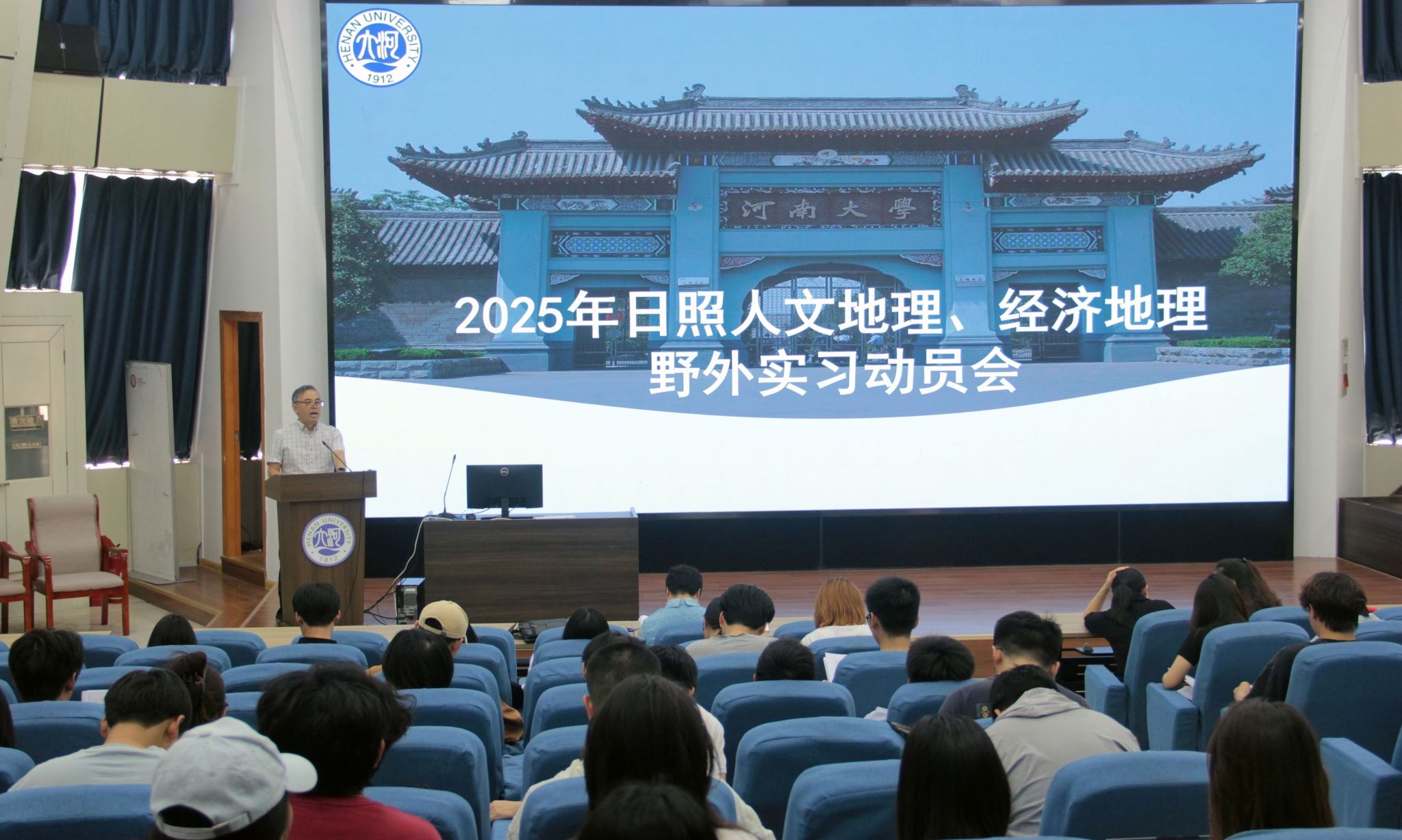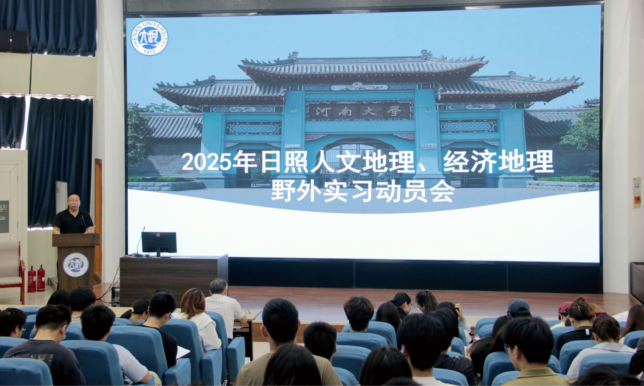 于金明校区景兰报告厅召开2025年日照人文地理、经济地理实习动员会。实习队指导老师秦明周、时振钦、吴娜琳、张洵赫、屈利铭等出席会议,2022级、2023级参加实习的200余名本科生参与会议。本次动员大会由实习队指导老师别乾龙主持。