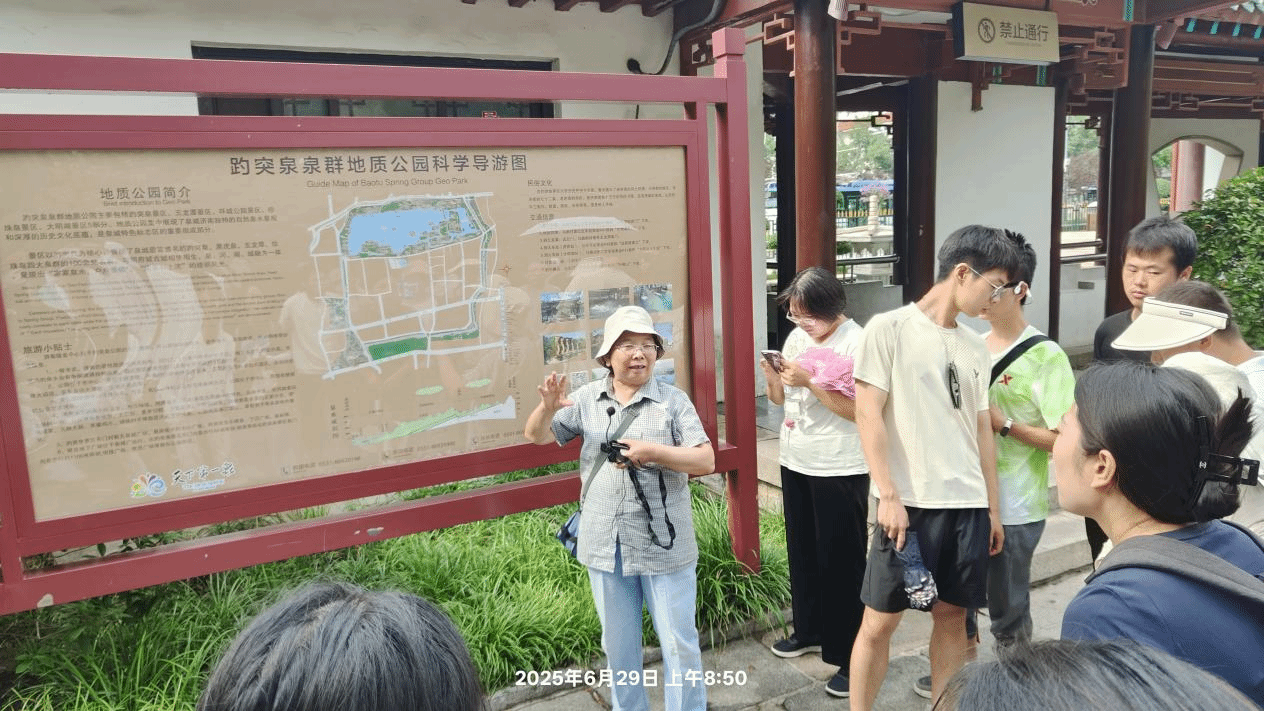 实习队首先抵达趵突泉公园。趵突泉位列济南“七十二名泉”之首,素有“天下第一泉”之誉。景区内古迹众多,包括泺源堂、观澜亭、李清照纪念堂等,承载着深厚的文化底蕴,为济南市标志性景观之一,彰显着泉城独特的自然与人文魅力。北京大学城市与环境学院蒙吉军研究员和许学工教授在公园东门处,结合景区绘制的趵突泉泉群地质公园示意图为同学们详细地讲解了济南成为“泉城”的地理条件基础、形成原因及影响因素。济南位于泰山断块凸起与华北凹陷的过渡带,千佛山断裂带与无影山断裂带在此交汇,从而形成了独特的“岩溶水漏斗区”。同时泉水喷涌的磅礴气势与清冽水质,印证了济南喀斯特地貌的水文特征。三股水柱四季恒温18℃,反映了地下岩溶结构的独特水系循环。古泉与历史建筑相映,自然与人文交融,深化了同学们对地理与文化共生关系的理解。此次游览既巩固了专业知识,亦激发了对自然奥秘的探索热情。
