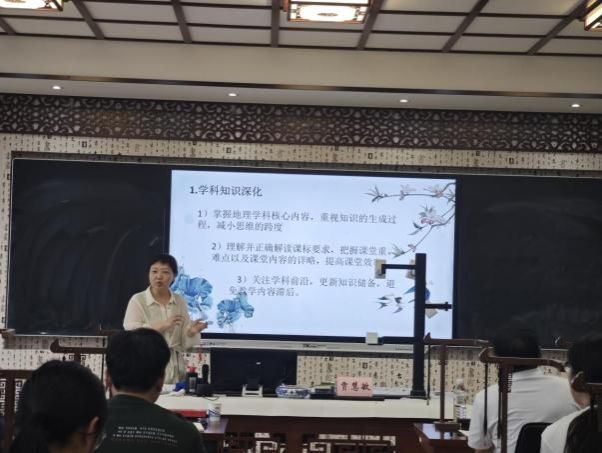 比赛结束后,五位评委老师从教姿教态、情境创设、板书板画、教学评一致性等方面对同学们的教学技能进行了评析与总结。其中三位中学老师还针对师范生教学技能培养做了专题报告。赵丽霞老师以“让地理教学回家”为题,围绕教学的主题设置、情境创新和跨学科教学展开深度剖析,以水资源与人类发展的相关案例为载体,强调要构建指向核心素养培养的主题式教学、指向问题解决的情境化教学、指向协同育人的跨学科教学,有效拓宽学生的思维,促进学生地理学科核心素养的达成。贾惠敏老师围绕“教师教学技能培养”,从教学设计、教学实施、学科知识等方面展开深入分享。她强调教师需构建扎实的专业根基、精准把握课标要求、融合探究式与小组合作学习模式,“要让地理课堂既接地气,又充满思辨魅力”。夏继宏老师以“核心素养下地理课堂教学重构思考”为主题,围绕教学设计的关注点、学科核心素养的形成机制、学科核心素养下教学观的重构、问题式教学模式探讨四个模块进行分享。夏老师通过工业的区位因素和地域文化两个案例剖析教材的二次开发,强调将知识结构化,助力提升同学们的备课与上课技能。最后,张广花老师对本次大赛进行了总结,再次肯定了同学们的精彩表现,并希望各位同学在未来的学习中持续精进教学技能,努力成为高素质、专业化、创新型的地理教师。