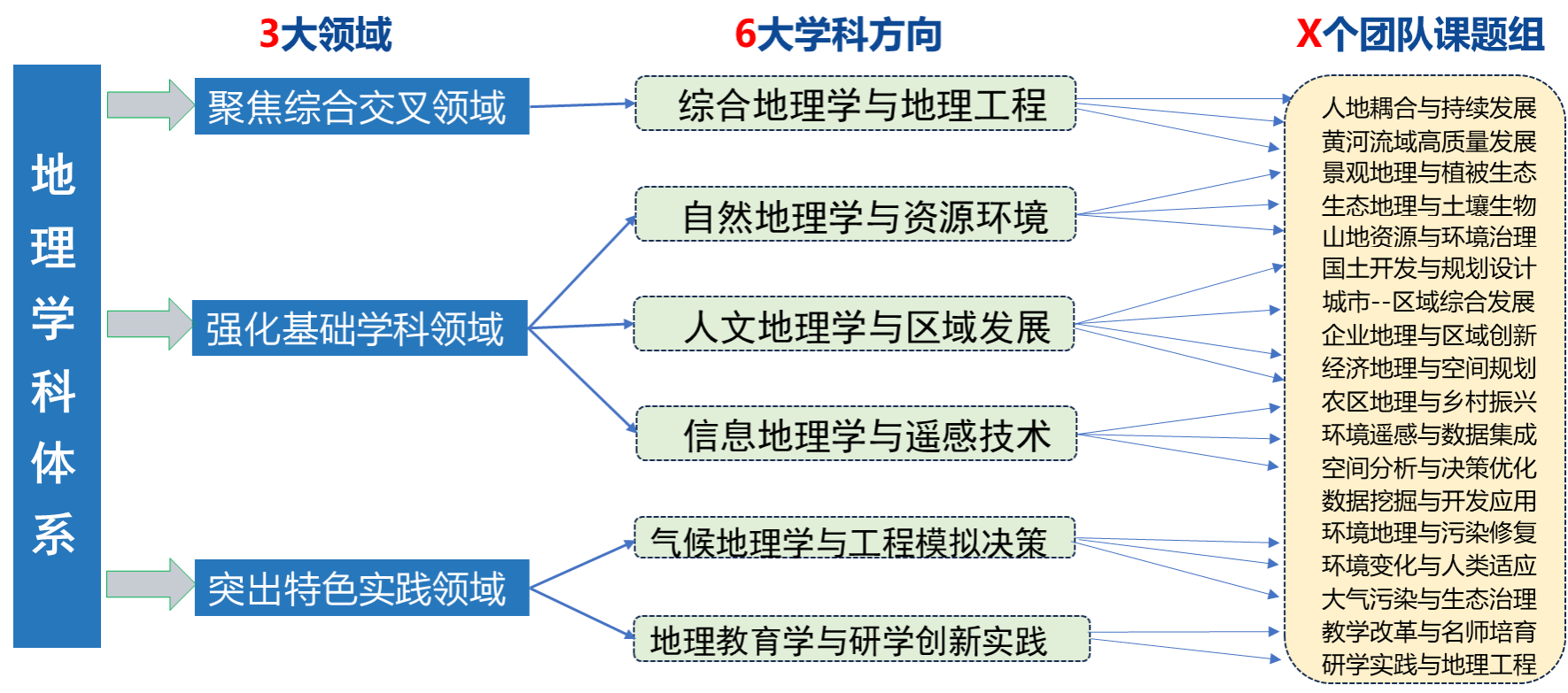 在学科建设方面,拥有地理学一级学科博士学位点和博士后科研流动站,下设自然地理学、人文地理学、地图学与地理信息系统、经济地理学、生态地理学、遥感信息科学与技术6个二级学科方向;设有测绘科学与技术、环境科学与工程、资源与环境3个一级学科硕士点;拥有地理科学、人文地理与城乡规划、地理信息科学、环境科学、测绘工程5个本科专业,地理信息科学(空间智能)、测绘工程(遥感智能)2个特色方向专业,地理科学(林伯襄计划)景兰工程实验班。
