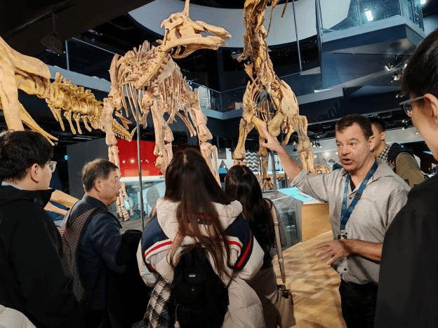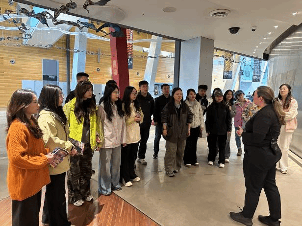 党委副书记徐小军开展了思政教学,勉励实习队成员珍惜海外实习机会,注重学思结合,开拓国际视野,为学部发展贡献青春力量。植物园作为世界知名的城市植物园,收藏了大量澳大利亚本土及国际植物资源,实习队深入了解了南半球典型植物的生长特征及其生态意义。随后,队员们来到墨尔本博物馆,墨尔本博物馆是南半球最大的博物馆之一,展陈内容涵盖自然历史、人类文明、科技创新等多个方面,位于皇家展览馆正对面,始建于1854年。实习队在专业人员的讲解下,了解了收藏的恐龙、袋鼠及其他动物的标准以及来源,其中墨尔本存放目前世界上最完整的三角龙化石,这具巨型骨架,身高约两米,体长6-7米,体重超一吨,保存完整骨架的85%,是墨尔本博物馆《三角龙:恐龙的命运》展览的核心展品。此次考察不仅深化了对古生物多样性与生态系统动态演变的认识,也激发了学生从地理与生态交叉视角进一步探究自然史的兴趣。