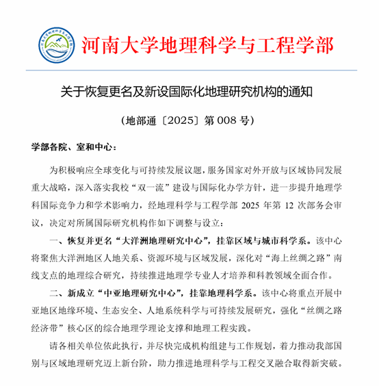 澳洲研究中心”。两大中心的揭牌成立,可有效推进从区域地理研究到国际平台智库服务的深度跨越,更好地构建“立足中原、面向全国、走向世界”的地理学部建设与学科发展新格局。据悉,两大中心以地理学为基础,未来将聚焦人地系统科学与可持续发展、综合地理学与地理工程、资源环境保护与区域创新、地缘关系与生态安全等领域研究,创建国际合作、科学攻关、人才培养与交流的长效机制,融合多学科力量在服务国家“一带一路”“海洋强国”战略中精准发力,持续提升地理学科的国际话语权与影响力,为国家高水平对外开放和人才引智创新工程提供智力支撑,在服务国家战略与学术前沿探索中持续贡献“河大地理力量”。