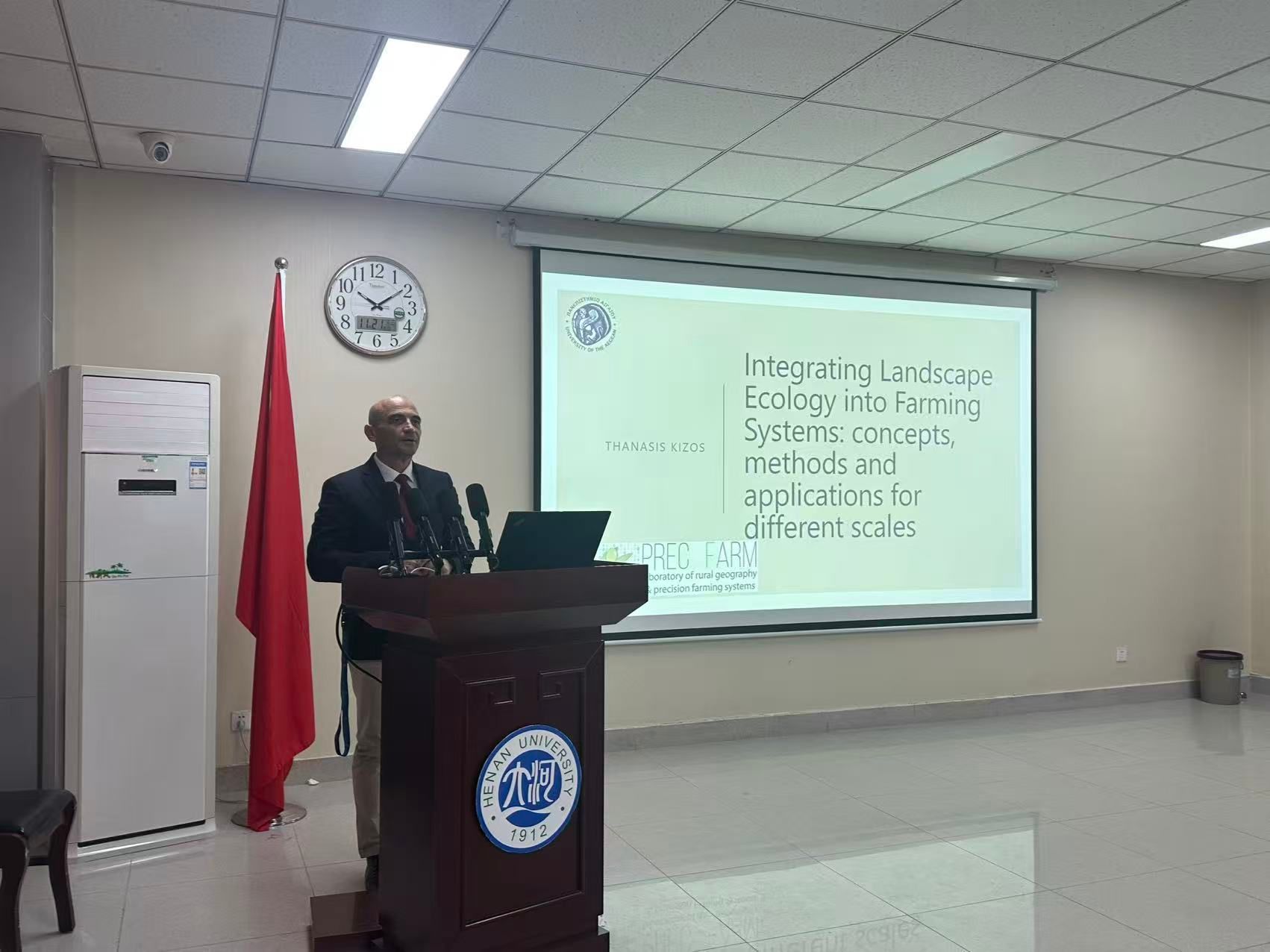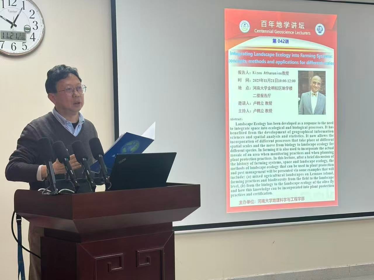 11月21日,应河南省地球系统观测与模拟重点实验室主任卢鹤立教授邀请,希腊爱琴海大学地理系主任Kizos Athanasios教授于地学楼二楼报告厅做了一场题为“生态系统变化与社会可持续发展耦合模拟进展与展望”的学术报告,吸引了百余名师生参会交流。此次交流活动由卢鹤立主持。