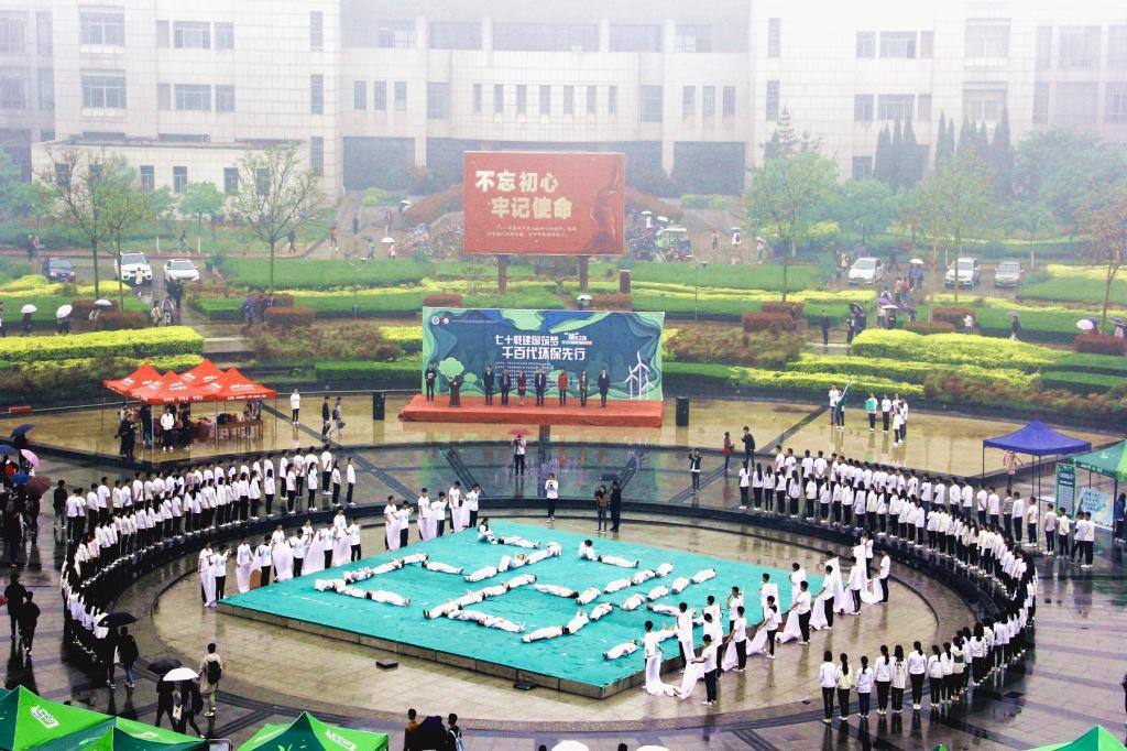在金明校区马可广场中央,百余位青年环保志愿者宣读环保誓词,誓言铿锵有力,回响震彻校园。随后,环境与规划学院党委书记闫峻宣布"球"生之路——4.22地球日系列活动正式启动。伴随着激昂的乐曲,会场上全体人员朗诵起《沁园春·长沙》,展现出青年参与环保行动的决心。"浪遏飞舟"音落,主舞台上的人体多米诺骨牌展开,呈现"422"的字样。