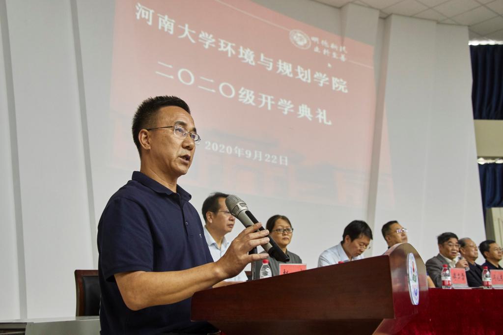 原副校长、博士生导师王发曾,省特聘教授、博士生导师卢鹤立及相关领导、教师、军训教官和2020级全体新生参加典礼。开学典礼由环境与规划学院党委书记闫峻主持。在威严庄重的国歌声中,新生开学典礼拉开了序幕。首先,院长傅声雷代表学院向全体2020级新生致辞,他细数了学院的光辉历史与前瞻突破,向新生详细介绍了学院的历史改革、学科队伍建设、国际交流与近年来的教学和科研成果。他指出,随着学院国际化水平不断提高,十余位海外讲座教授受聘我院任教,三十余位教师出国访学,学院正向着实现国内双一流、国际有重要影响的研究型特色学院逐步迈进。会上,院长傅声雷与新生进行了亲密互动,表达了对新生殷切的期望,强调新生应当志存高远,脚踏实地,致力于实现人生目标。