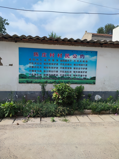 调研团于7月13日上午9点左右抵达陈庄村,团队成员先后参观了村内的红色文化长廊、乡愁纪念馆、健身广场和绿色蔬果大棚,对当地的党建情况和经济发展情况有了初步的认识。此外,团队成员通过实地考察了解了村落的绿化情况、街道状况、街道卫生维护情况、垃圾桶数量分布情况、村民家中自来水及厕所状况、家庭医生配置以及垃圾分类情况。
