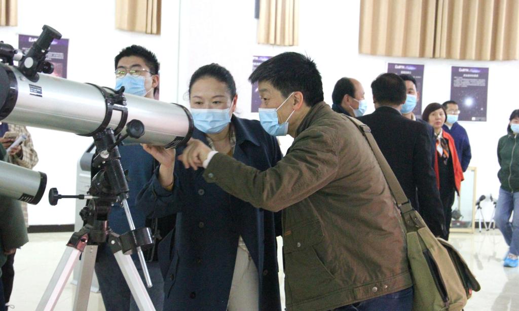 随后,科普团队与学生一起参观观象台,许立民借助天文望远镜等设备为宋城小学教师讲解专业天文知识,分享天文观测经验。他着重阐述了如何在夜空中寻找北极星、如何使用望远镜自动寻星等问题。同时,宋城小学教师带领孩子们探索宇宙,为学生讲述宇宙行星、星云与星座的相关知识。