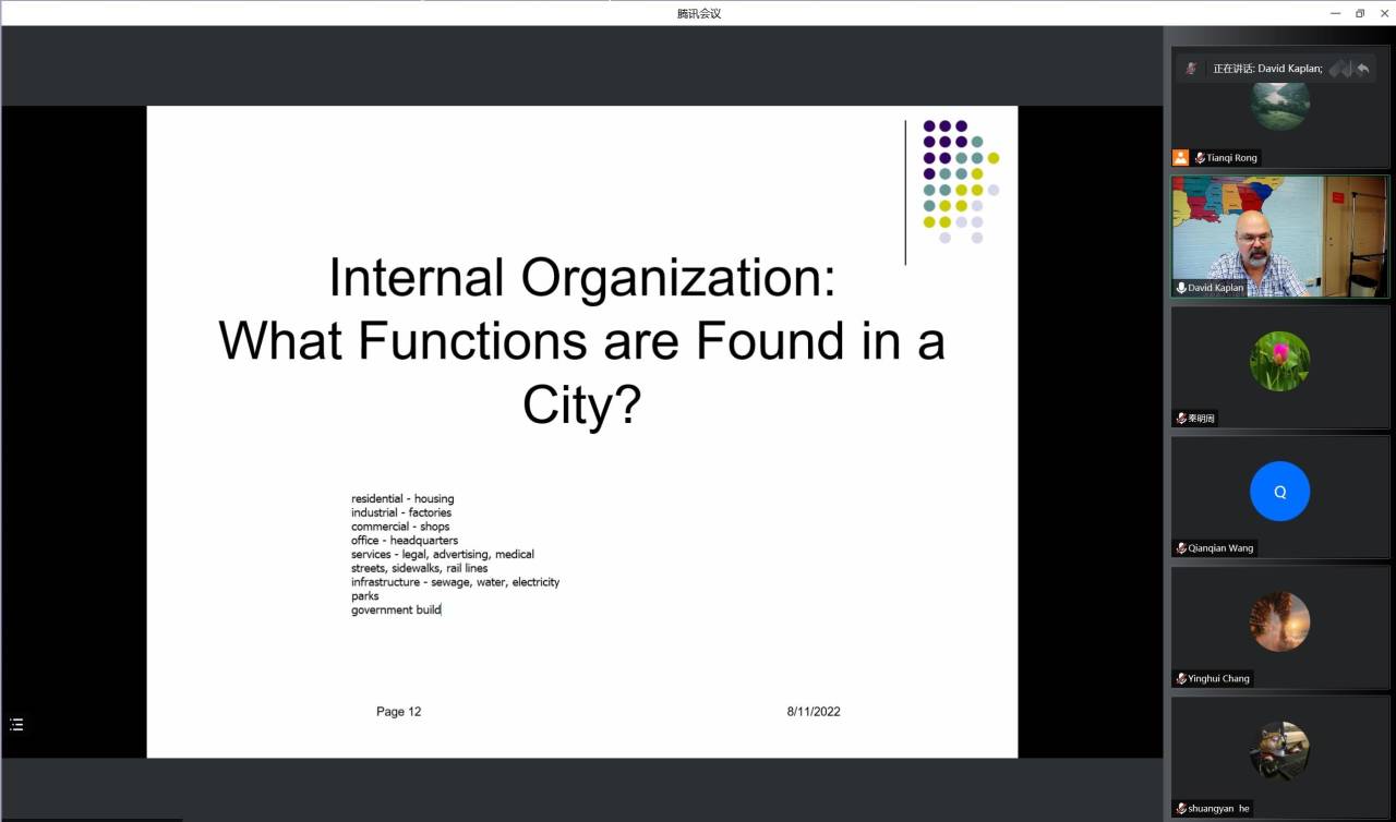 David Kaplan教授从自己的研究方向出发,首先讲解了不同地区对城市的定义,城市形成的原因,古城与乡村/部落生活的区别,城市形成的前提条件,主要包括社会、生态和技术。其次,他讲解了古代城市的特征、中东地区的古代城市。最后,他总结了古代城市的模式,城市扩散的因素,主要包括农业技术进步、交通技术进步、军事因素。David Kaplan教授还讲解了世界城市化发展的进程,首先他指出世界城市化在增加,并分析了不同地区的城市化发展,城市化与GDP之间的关系,并讲解了城市化曲线。其次他讲解了城市出现的地点和原因,主要包括材料、运输线路、特殊功能、中心位置,城市的功能(包括居住、工业、商业、服务、交通、基础设施、政府、教育等)以及美国的经典城市组织。最后,他介绍了城市规划、不同的城市规划理念以及如何提高城市的经济,并展示了不同地区的规划成果。