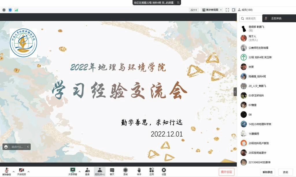 为了使2022级新生尽快投入到新的学习生活中,12月1日下午,我院通过线上腾讯会议的方式开展以“求学善思,求职行远” 为主题的学习经验交流会。会议由2022级学生代表林晋、陆福强主持。
