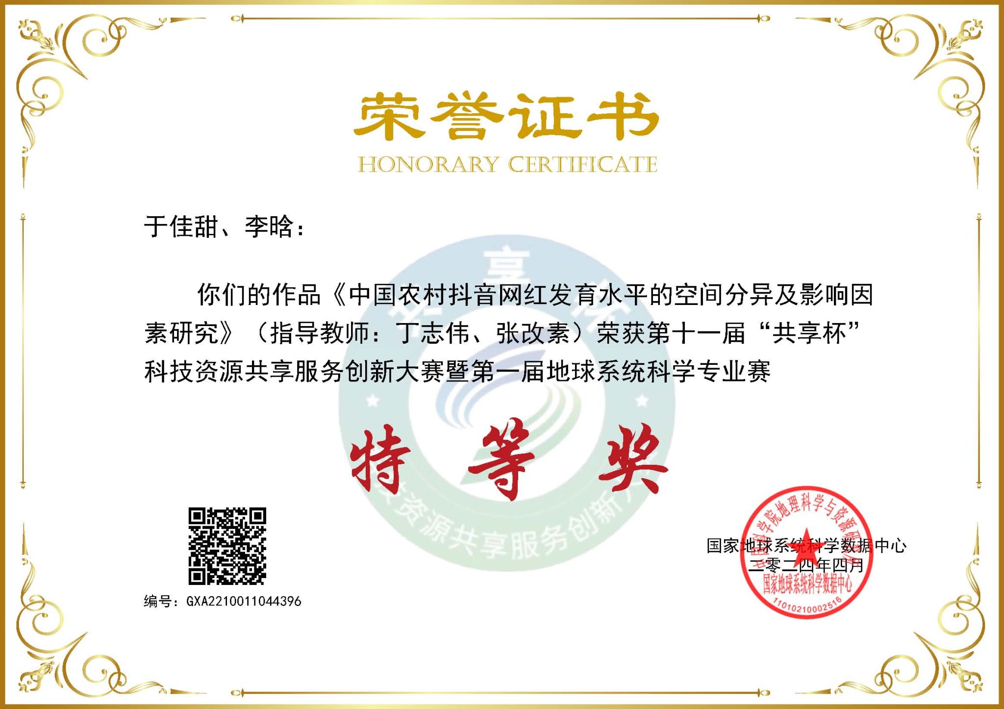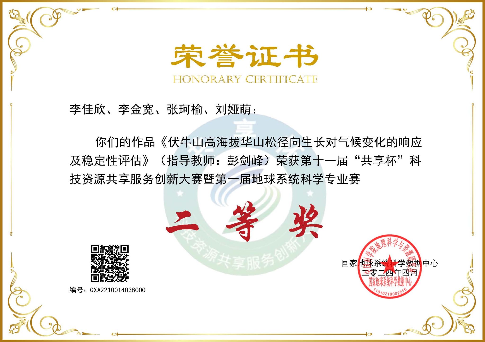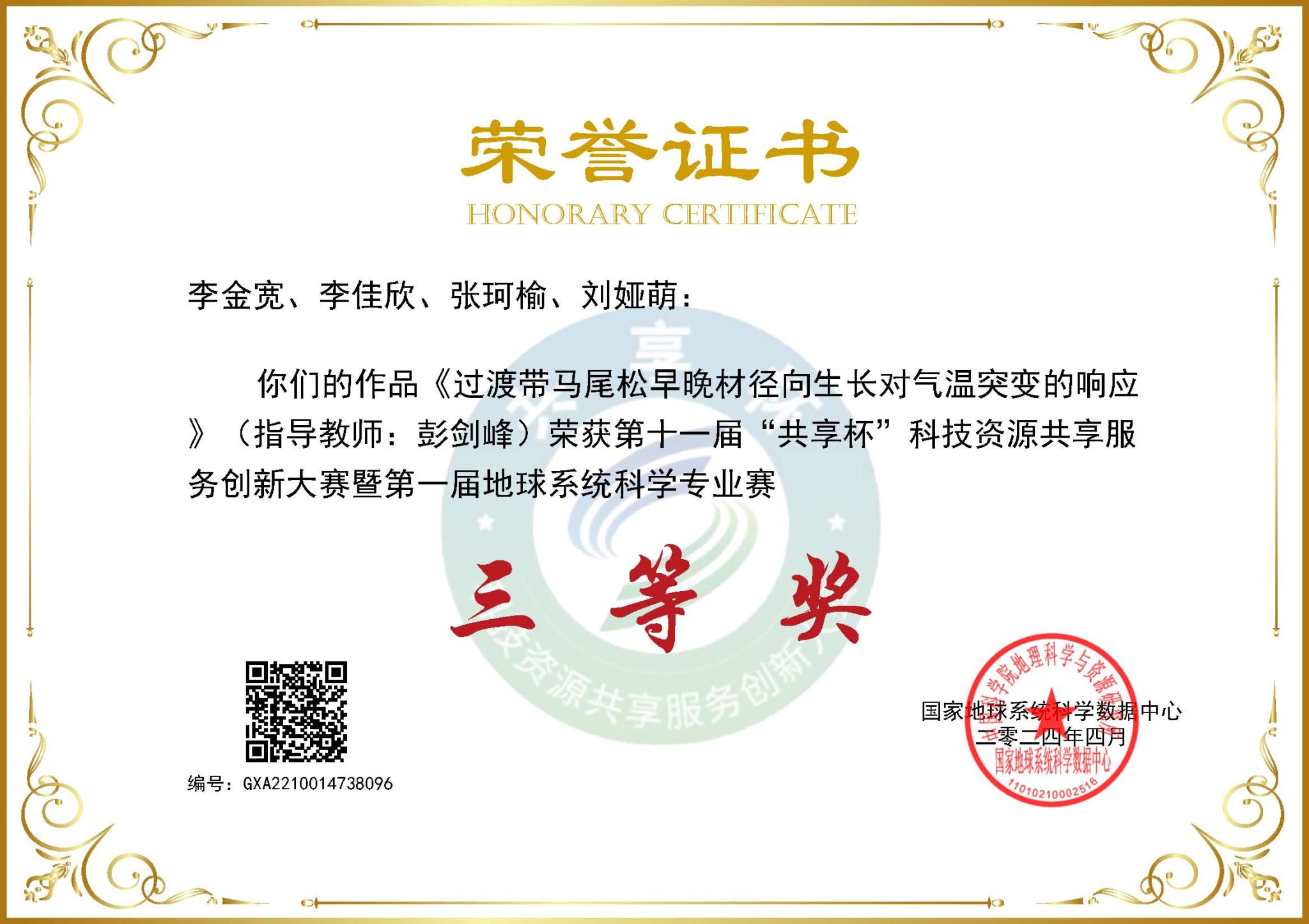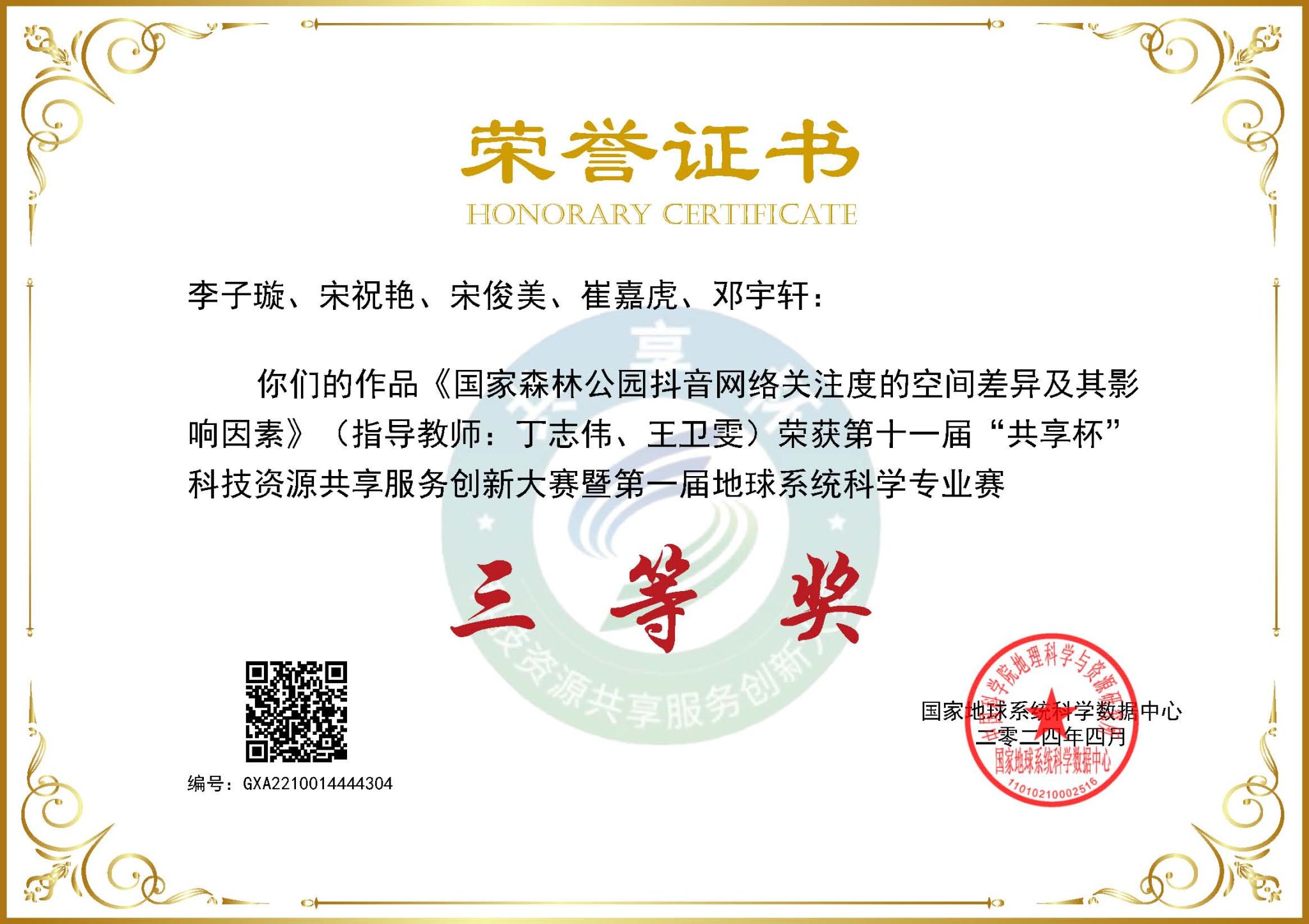 我校国家地球系统科学数据中心黄河中下游数据分中心、学生处、教务处、研究生院、地理与环境学院、计算机与信息工程学院、黄河文明和可持续发展研究中心等部门积极宣传和组织,选派本科生、研究生多支队伍参赛。其中,于佳甜、李晗组成的研究生团队作品《中国农村抖音网红发育水平的空间分异及影响因素分析》(指导老师:丁志伟、张改素)获得全国特等奖,丁志伟老师荣获优秀指导教师;李佳欣、李金宽、张柯榆、刘娅萌组成的研究生团队作品《伏牛山高海拔华山松径向生长对气候变化的响应及稳定性评估》荣获全国二等奖(指导老师:彭剑峰);李子璇、宋祝艳、宋俊美、崔嘉虎、邓宇轩组成的本科生团队作品《国家森林公园抖音网络关注度的空间差异及其影响因素》(指导老师:丁志伟、王卫雯),李郭宇、李蕍、桂诗源、张文硕、帅志豪组成的本硕团队作品《面向双碳战略的卫星遥感监测与反演系统》(指导老师:曹堃、张磊),李金宽、李佳欣、张珂榆、刘娅萌组成的研究生团队作品《过渡带马尾松早晚材径向生长对气温突变的响应》荣获全国三等奖(指导老师:彭剑峰)。