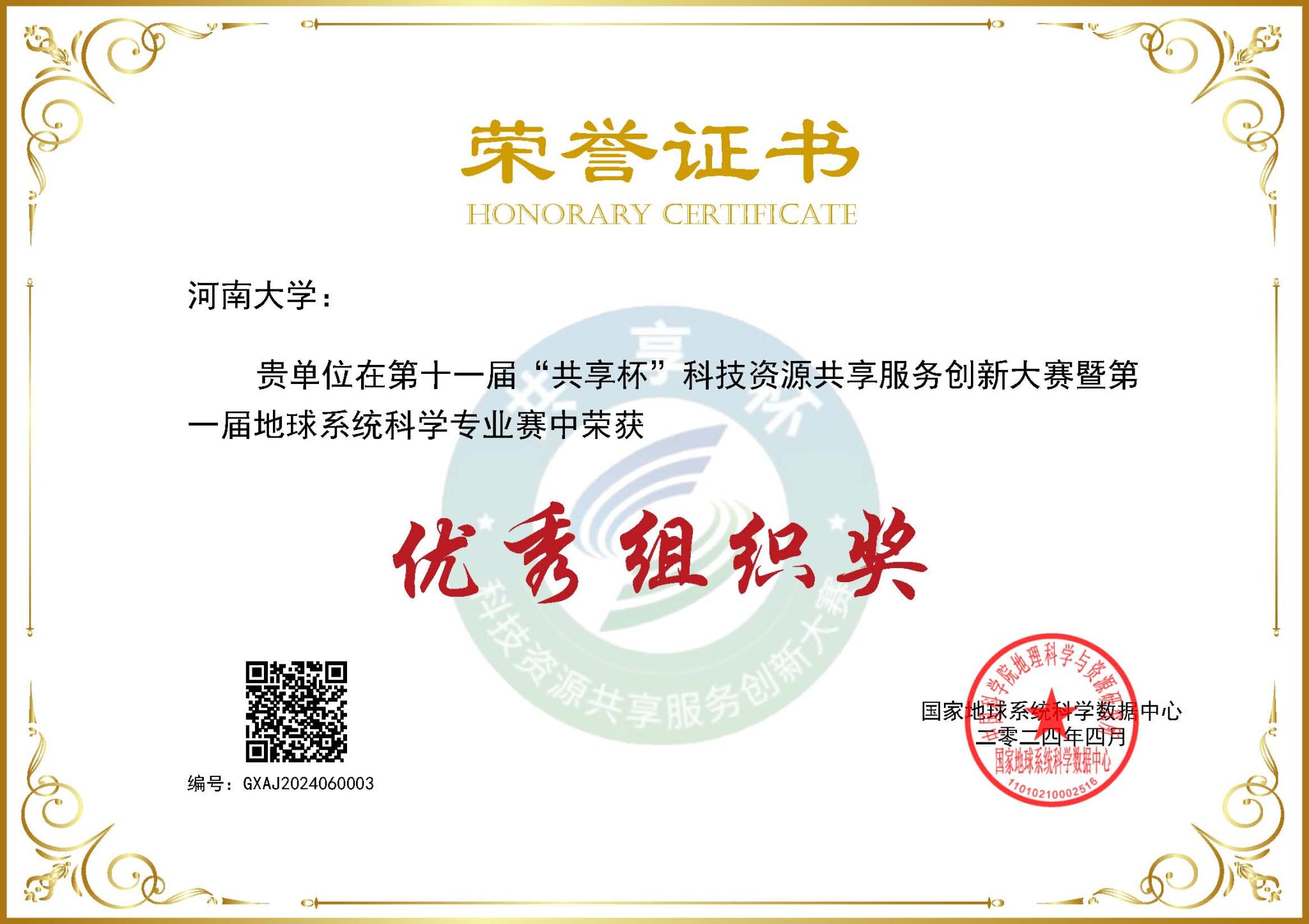 4月2日,由国家地球系统科学数据中心主办的第十一届“共享杯”科技资源共享服务创新大赛暨首届地球系统科学专业赛获奖名单揭晓。我校师生表现优异,斩获特等奖1项、二等奖1项、三等奖3项、优秀奖9项和优秀指导老师奖1项,我校获“优秀组织奖”。据悉,本届大赛历时五个多月,共有全国123所高校、6家科研院所和3家创新公司参赛,535个团队参与报名,收到作品597件。