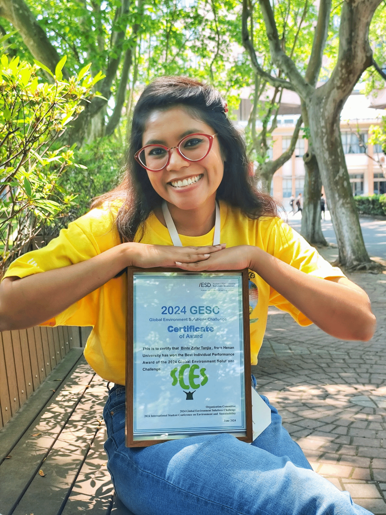 地理与环境学院人文地理学专业博士生Tanjia Binte Zafar(孟加拉籍)与Hewa Beddage Thilini Prathibani Jayathilaka(斯里兰卡籍)以“生态勇士(Eco-Warriors)”的名字参赛,提出了一个由玉米淀粉制成的生物塑料项目,分析了塑料污染的可持续解决方案,旨在帮助实现可持续发展目标。他们的创新方法和系统方案赢得了进入半决赛的机会,现场的表现获得了评委组的认可。经过激烈角逐,Tanjia Binte Zafar凭借出色的演讲技巧和对主题的深刻理解赢得了最佳个人表现奖。获奖后的Tanjia Binte Zafar表示,此次比赛让她收获了更专业化的成长路径并对香蕉视频