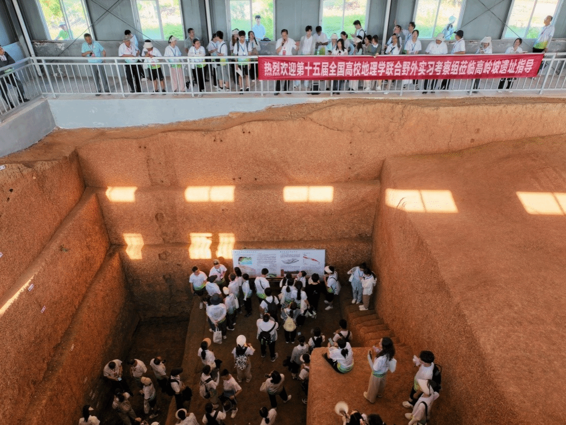 同学们随后来到遗址内部并对遗址的沉积剖面进行了近距离观察。根据南宁师范大学的李国山博士、高超博士介绍,按照考古学的地层划分方法,参考土色和土质的变化及包含物的不同进行划分,高岭坡遗址堆积物剖面从地表到砾石层一共划分出17层。参观完毕后,老师还与同学们就古地磁年代、释光测年、阶地堆积物风成说与水成说、网纹红土成因机制等感兴趣的话题进行了热烈讨论。