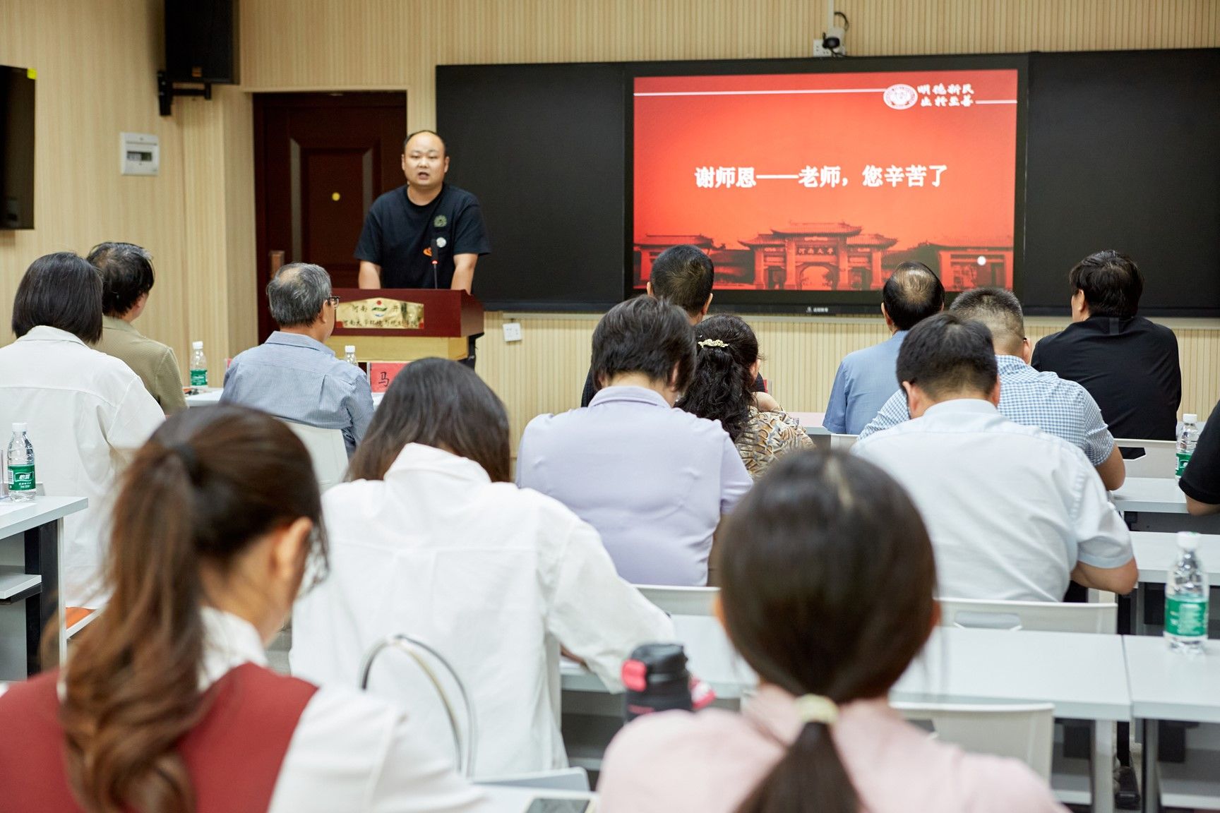 学院执行院长赵威讲话。他向勤奋耕耘、辛劳工作的广大教师致以节日的问候,并号召学院教职工在未来的工作当中,应当坚守为党育人、为国育才的初心使命,树立“躬耕教坛、强国有我”的志向和抱负,以高质量师德师风建设赋能教育高质量发展,助力学院一流学科建设。随后,与会学生手捧鲜花,排列成整齐的队伍,为教师代表送上鲜花和拥抱。老师们接过美丽的鲜花,灿烂若霞的笑容在脸上绽放,内心如蜜一般甘甜。