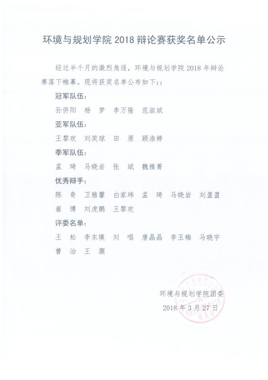 【公  示】环境与规划学院2018辩论赛获奖名单公示