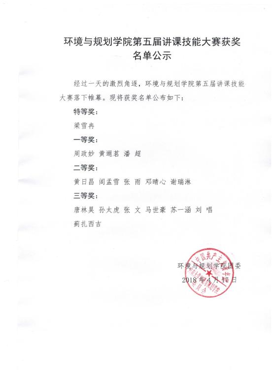【公  示】环境与规划学院第五届讲课技能大赛获奖名单公示