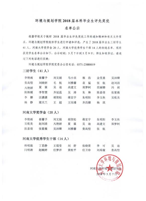 【公  示】环境与规划学院2018届本科毕业生评先奖优名单公示