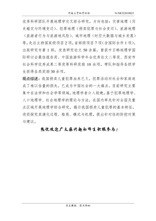 【地学论坛】李钢:中国拐卖儿童的犯罪地理与人口地理成因(时间:10.28(周日),9:00-11:00)