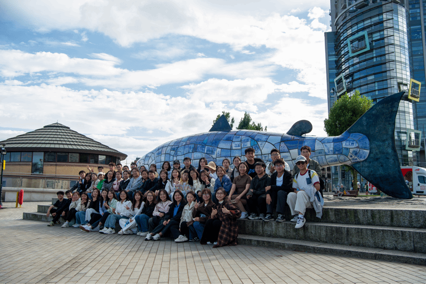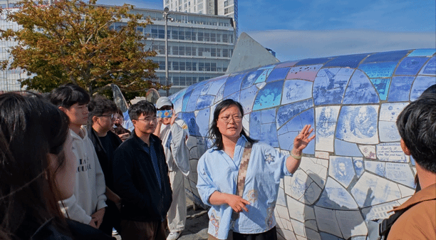行程最后,师生一行参观了贝尔法斯特的地标性建筑——阿尔伯特纪念钟塔(Albert Memorial Clock Tower)及“知识的三文鱼”雕塑(Big Fish)。阿尔伯特纪念钟塔因其显著的倾斜而闻名,被称为“贝尔法斯特的比萨斜塔”,该现象与海滨城市不可避免的地面下陷有关,揭示了城市地质条件对建筑结构稳定性的影响,同学们在实地观察中,直观认识到了地质学、建筑学与城市规划之间的紧密联系。“知识的三文鱼”雕塑,不仅是贝尔法斯特的旅游标志,也是城市的文化符号,为同学们探讨文化地理学中公共艺术与城市文化形象塑造的关系提供了一个绝佳的学习案例,进一步理解了地理学在文化表达和城市形象塑造中的作用。
