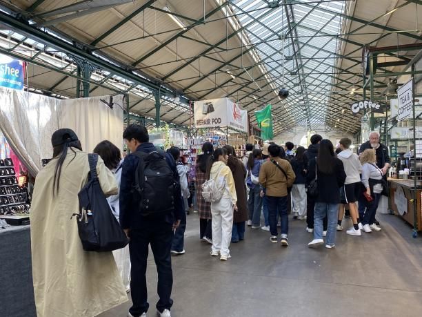 下午,同学们在带队老师的带领下自由参观了圣乔治市场(St George’s Market)。这个历史悠久的市场,不仅展示了贝尔法斯特的特色美食,还汇聚了来自各地的手工艺品,为同学们提供了观察城市经济与文化地理的机会,体会当地特色的生活气息与商业氛围。实习途中,实习队还在车上参观了巴洛克复兴风格的贝尔法斯特市政厅,领略了城市行政中心的建筑美学和历史内涵。通过对市政厅建筑及周边区域的考察,同学们进一步了解了城市地理学中政治地理及其对城市布局和功能区划的影响。