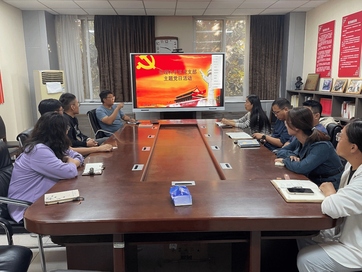 学习贯彻党的二十届三中全会精神省委宣讲团报告会会议精神,深入学习贯彻党的二十届三中全会精神,提高支部全体党员的党性修养,地理科学系党支部于10月10日下午在地学楼二楼党支部书记活动室召开了主题党日活动。活动由地理科学系党支部书记李开封主持,支部全体党员参加。