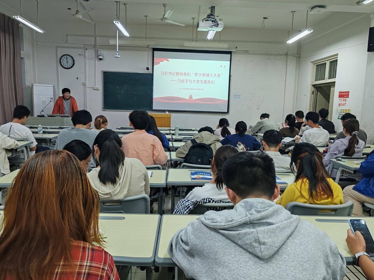 感悟领袖关怀,勇担青春使命。为学习感悟习近平总书记对新时代青年的殷切寄语,引导大学生感受习近平总书记的思想伟力、领袖风范、人格魅力,进一步深化思想认同、实践认同、情感认同,10月15日晚,我院2023级地理信息科学班团支部于金明校区综合教学楼3408教室开展“习近平总书记勉励我们‘把小我融入大我’——习近平与大学生朋友们”主题团日活动。本次团日活动由团支部书记廉昊轩主持,团支部全体团员参加。
