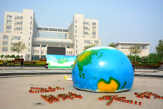 广场正中央的石台上,放置着一个半球形充气帐篷,外部画成了宇宙中蔚蓝地球的模样。半球形的内部“住着”十个代表国家的标志建筑和用废旧衣服剪成的雾霾云朵,在“乌云”上签下自己的环保宣言并撕下带走,地球就会露出蓝天和白云的美好景象。