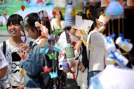 商学院的赵冬晴听到这声响,快步走到摊位前,看着悬挂的各式各样的风铃,惊叹“真漂亮呀”。她摇着同伴的胳膊,兴奋地说:“我们也自己动手做一个,挂在宿舍吧。这样不仅有意义,也参与了环保。”