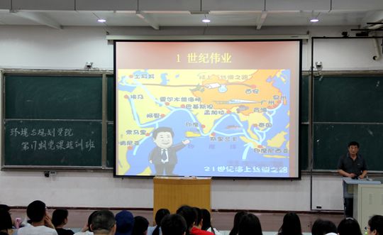 王发曾教授结合同学们所学专业,从国家、经济及地理三个方面出发,以“丝路经济带战略的中原行动”为主题展开讲解。王教授把所讲内容分为 “世纪伟业”、“空间格局”、“融入途径”和“卅年光景”四个部分。在第一部分,王教授通过今昔对比来表明中国现已屹立于世界民族之林,他指出“丝路经济带战略”正是我们强盛中国、构建全球化的重大谋略,也正是中国开放包容、广交朋友的具体表现,这大大地增强了同学们的民族自豪感,也使同学们对党的正确领导充满信心。在第二、三部分,王教授主要讲述了我国及中原地区对于未来城市建设格局的规划与发展方向。在第四部分,他带领同学们畅想未来,为同学们描绘了一幅中原地区乃至全国发展的美好蓝图,以生动形象的演说告诉同学们,在中国共产党的领导下,我们的祖国将会越来越好,增强了同学们早日加入中国共产党决心。