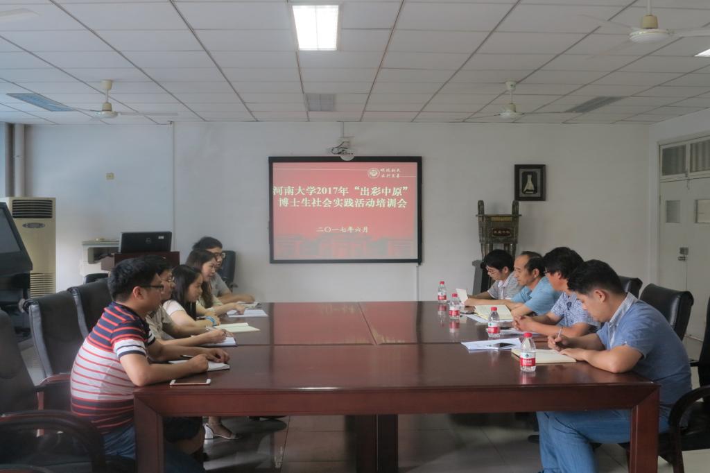 6月26日下午,2017年“出彩中原”博士生社会实践活动培训会在我院二楼资料室举办,校人事处副处长、教师发展中心主任、博士生导师高建华、学院研究生管理办公室主任陈太政、硕士研究生导师丁志伟、学院团委书记宋永鹏以及本次实践团队的五名博士生参加会议。会议由学院党委副书记刘会军主持。