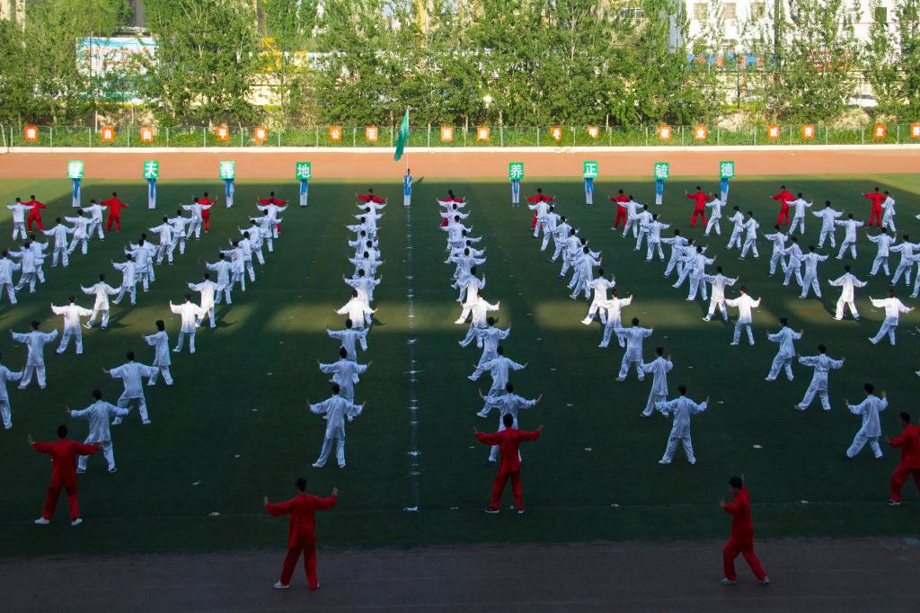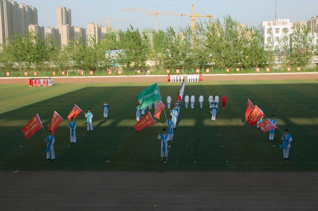 我院17级代表队最后上场。在气势恢宏的武侠音乐中,旗手和舞蹈队员们闪亮登场,部分参赛选手随之以十字散开,队形整齐有序,一步到位。旗手们铿锵有力的挥舞着旗帜,曼妙的舞姿、潇洒的挥剑、飘逸的裙摆,赢得了主席台观众们的热烈掌声。随后,在领队的一声令下,太极方阵分别从两边和后方同时进场,并进行迅速调整,俨然有序、整装待发。太极音乐响起后,队员们合着音乐的节拍起势、转身、俯身下按,个个挥洒自如,连贯有序。同学们将太极拳含蓄内敛、以柔克刚、急缓相间的拳术风格淋漓尽致地展现在裁判眼前,就如“一匹匹野马在整齐分鬃,一个个白鹤在舒缓展翅。”值得一提的是,我院队员脸上的地球标识格外引人注目,新颖有趣。队员们的动作娴熟自如,队列整齐划一,完美地诠释了中国传统太极拳的独特魅力。最终,我院在本次太极拳比赛中荣获第八名。