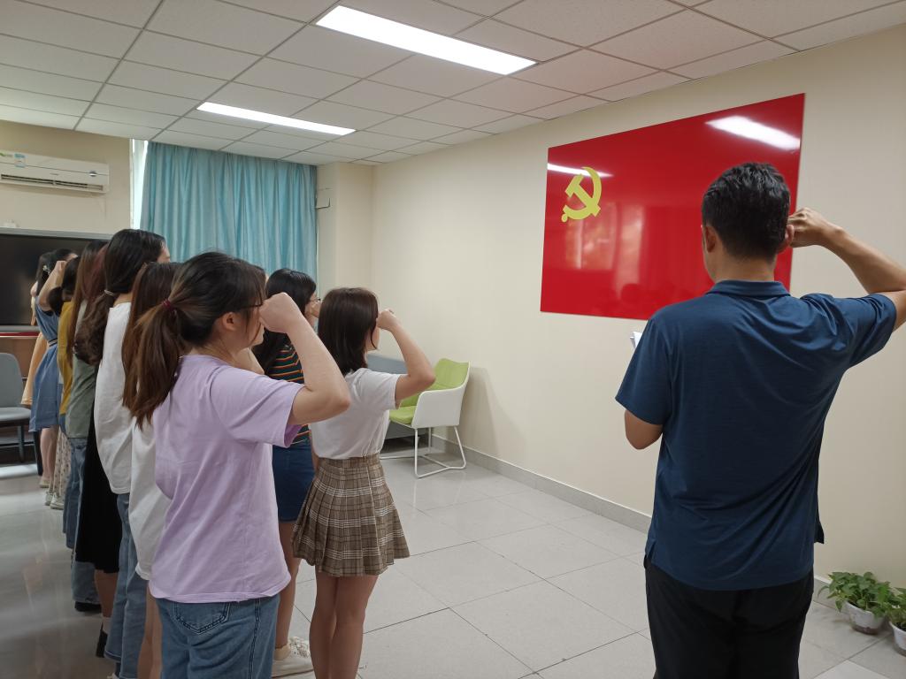 最后,在本科生第一党支部书记宋永鹏同志的领誓下,新发展预备党员面向党旗举起右拳,一起宣读了入党誓词并合影留念。