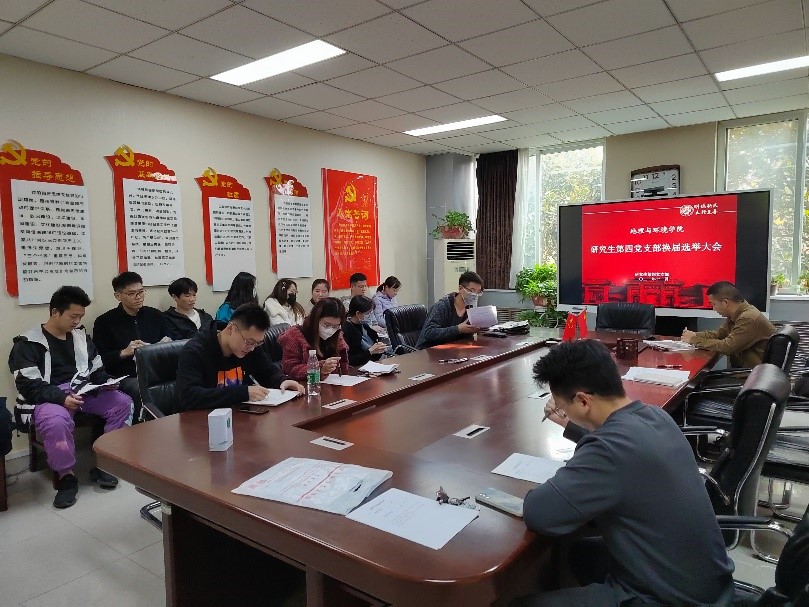 根据《中国共产党章程》《中国共产党基层组织选举工作条例》等有关党内法规要求,11月16日下午两点半,地理与环境学院研究生第一党支部、第四党支部在学院二楼报告厅召开换届选举大会,2020级研究生辅导员时振钦出席会议,会议由上届研究生第一党支部组织委员田卡吨同志主持。