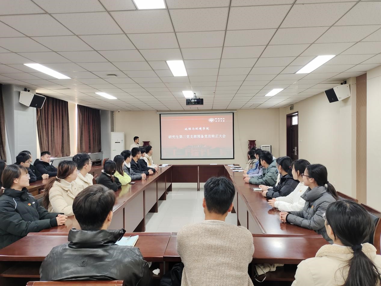 12月19日中午12:00,地理与环境学院研究生第三党支部在学院二楼报告厅召开预备党员转正大会,参加会议的有研究生第三党支部全体正式党员和预备党员,会议由研究生第三党支部书记李万隆主持。