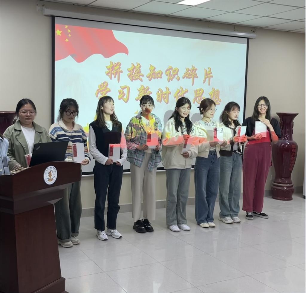 第二环节开展“拼接知识碎片”趣味游戏。游戏开始,学习小组成员段园凯介绍游戏规则,本次趣味游戏准备了三类“知识卡片”:第一类卡片上写着不同的习近平新时代中国特色社会主义思想具体内容;第二类为其对应提出的时间;第三类为提出的会议名称。每组成员需要完成知识卡片的拼接,限时5分钟,在规定时间将三种卡片拼接正确最多的小组获胜。游戏过程中,同学们积极答题,气氛紧张而热烈。游戏结束后,学习小组成员现场对答题结果进行统计,第四小组获一等奖,第七小组获二等奖,第八小组获三等奖。随后,党支部支委为在游戏中表现优秀的小组颁发奖品。