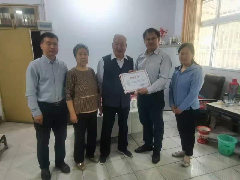 到达方毓昌先生家中后,郑洪涛代表学院感谢方毓昌先生对母校的深情厚谊,将珍藏多年的一块龟化石和部分标本捐赠给学院。郑洪涛向方毓昌先生颁发了捐赠证书,简要介绍了学校、学院目前良好的发展态势并诚恳邀请方先生出席明年学校的110周年校庆活动。
