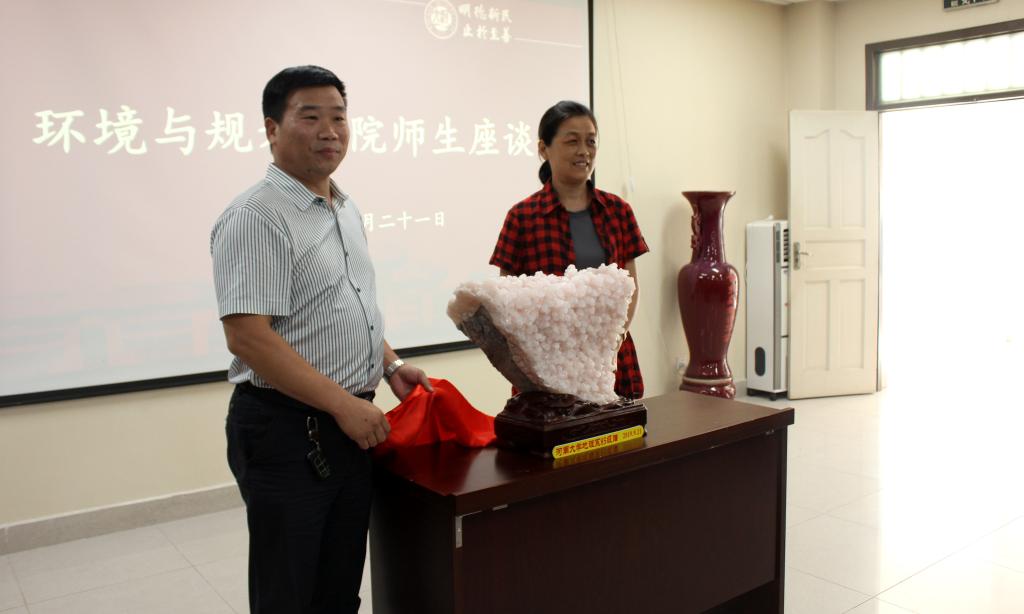 随后,校友代表向我院捐赠了稀有的含锰方解石标本,并祝愿我院双一流建取得持久胜利。