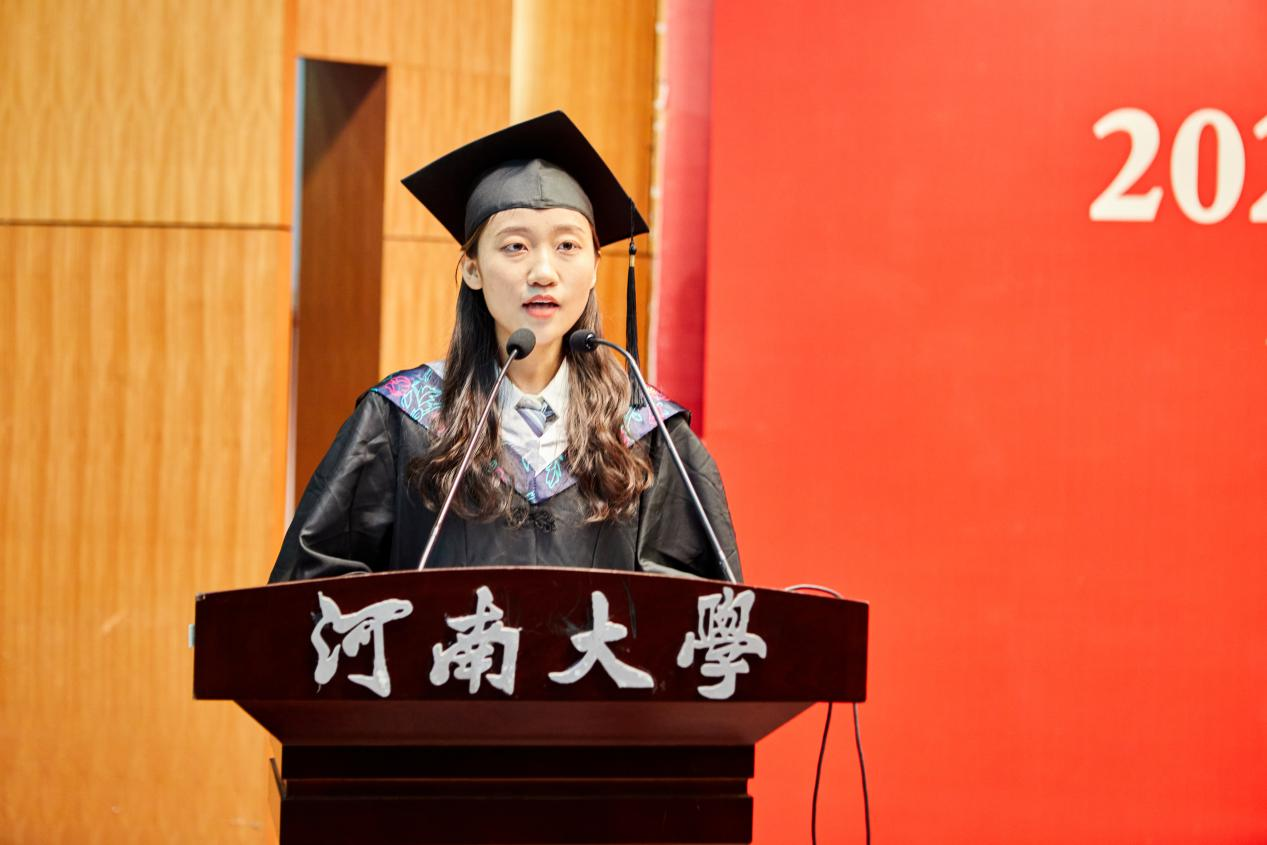 毕业生代表李汶莉代表全体2021届本科毕业生向学校、学院及各位老师表示衷心的感谢和崇高的敬意。她感慨大学四年的时光飞逝,回顾所经历的点点滴滴,表示一定会铭记校训,坚守地学精神,成为有理想、有本领、有担当的新时代青年,并祝愿学院承积厚蕴,更展宏图,愿全体毕业生们不负韶华,未来可期。在校生代表、院学生会主席、2018级环境科学专业学生刘鑫为学长学姐送上衷心的祝福,感谢他们在学习生活上无微不至的关怀和指导,祝愿他们早日实现人生理想,今日一别前程似锦,他日再逢眉眼如初!
