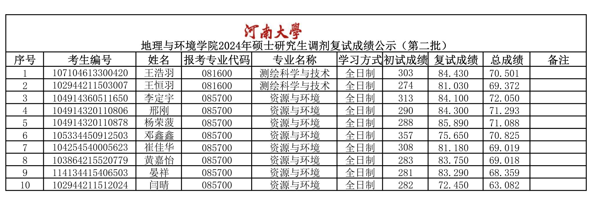 香蕉视频 地理与环境学院2024年硕士研究生第二轮调剂复试成绩公示