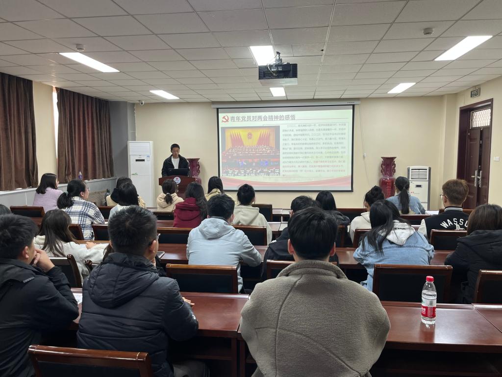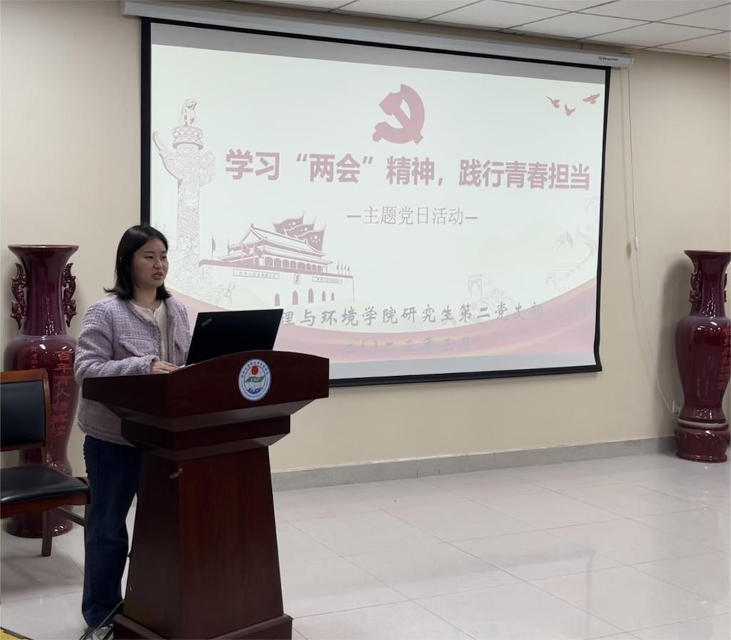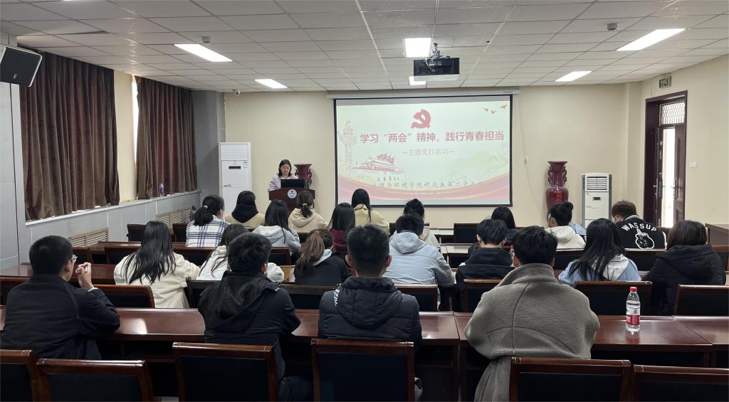 为深入学习宣传贯彻习近平总书记在“两会”期间的重要讲话精神和全国“两会”精神,以高质量党建引领发展,3月25日,研究生第二党支部于学院二楼报告厅开展“学习‘两会’精神,践行青春担当”主题党日活动,会议由支部书记陆蓉主持。